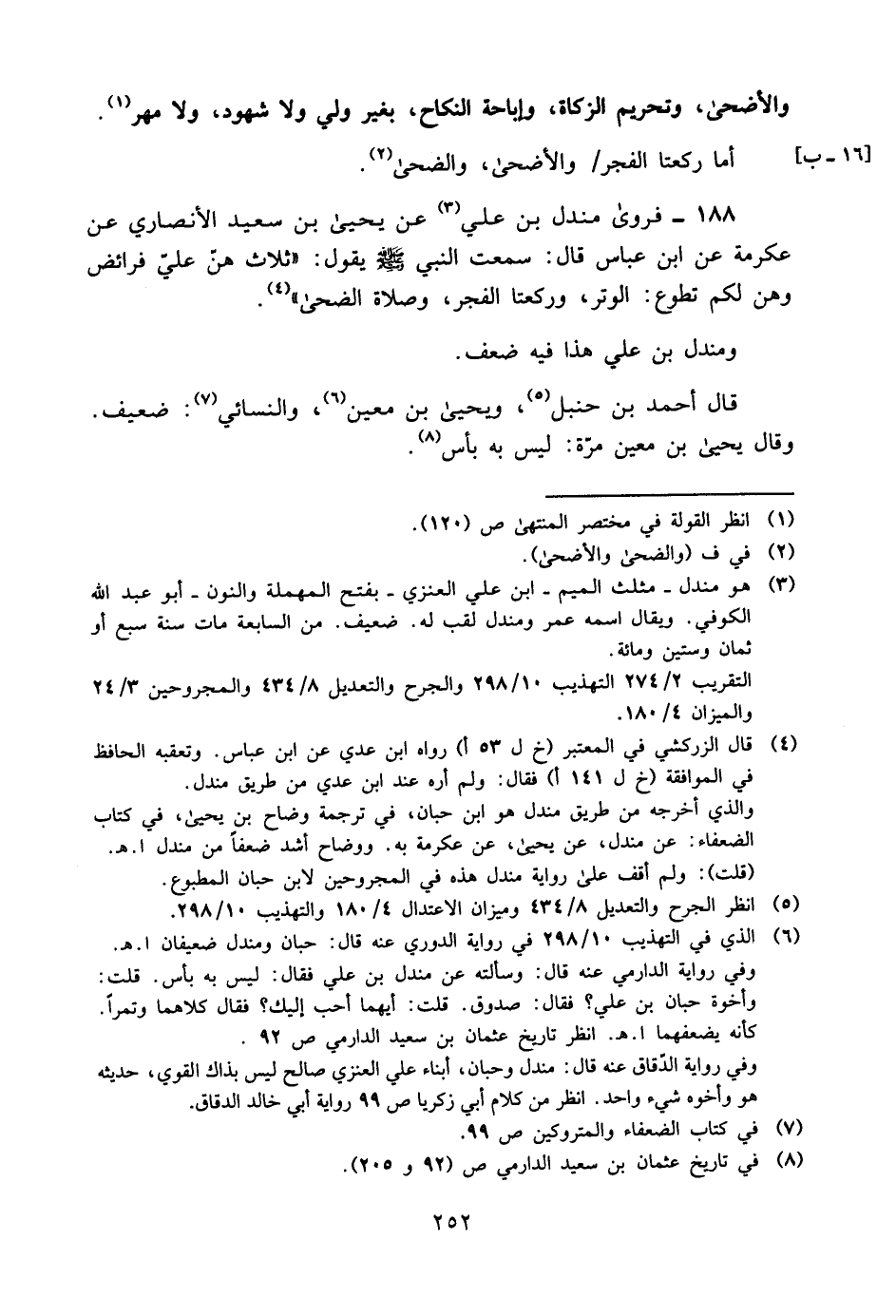 188- فروى مندل بن علي3 عن يحيى بن سعيد الأنصاري, عن عكرمة, عن ابن عباس قال: سمعت النبي -صلى الله عليه وسلم- يقول: "ثلاث هن علي فرائض, وهن لكم تطوع: الوتر، وركعتا الفجر، وصلاة الضحى"4.