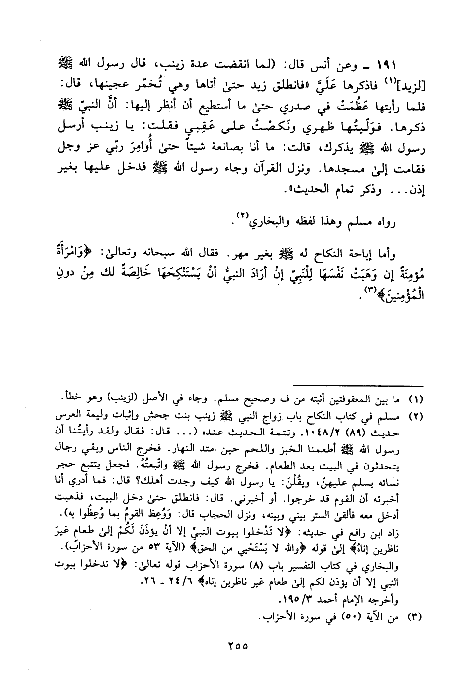 والبخاري في كتاب التفسير, باب "8" سورة الأحزاب, قوله تعالى: {لَا تَدْخُلُوا بُيُوتَ النَّبِيِّ إِلَّا أَنْ يُؤْذَنَ لَكُمْ إِلَى طَعَامٍ غَيْرَ نَاظِرِينَ إِنَاهُ} 6/ 24-26.