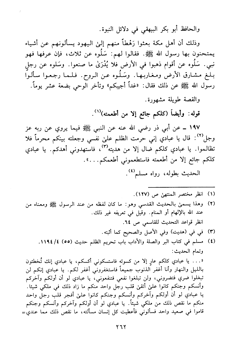 197- عن أبي ذر -رضي الله عنه- عن النبي -صلى الله عليه وسلم- فيما يروي عن ربه عز وجل2: "قال: يا عبادي, إن حرمت الظلم على نفسي وجعلته بينكم محرما فلا تظالموا. يا عبادي, كلكم ضالّ إلا من هديته 3، فاستهدوني أهدكم. يا عبادي, كلكم جائع إلا من أطعمته فاستطعموني أطعمكم ... ".