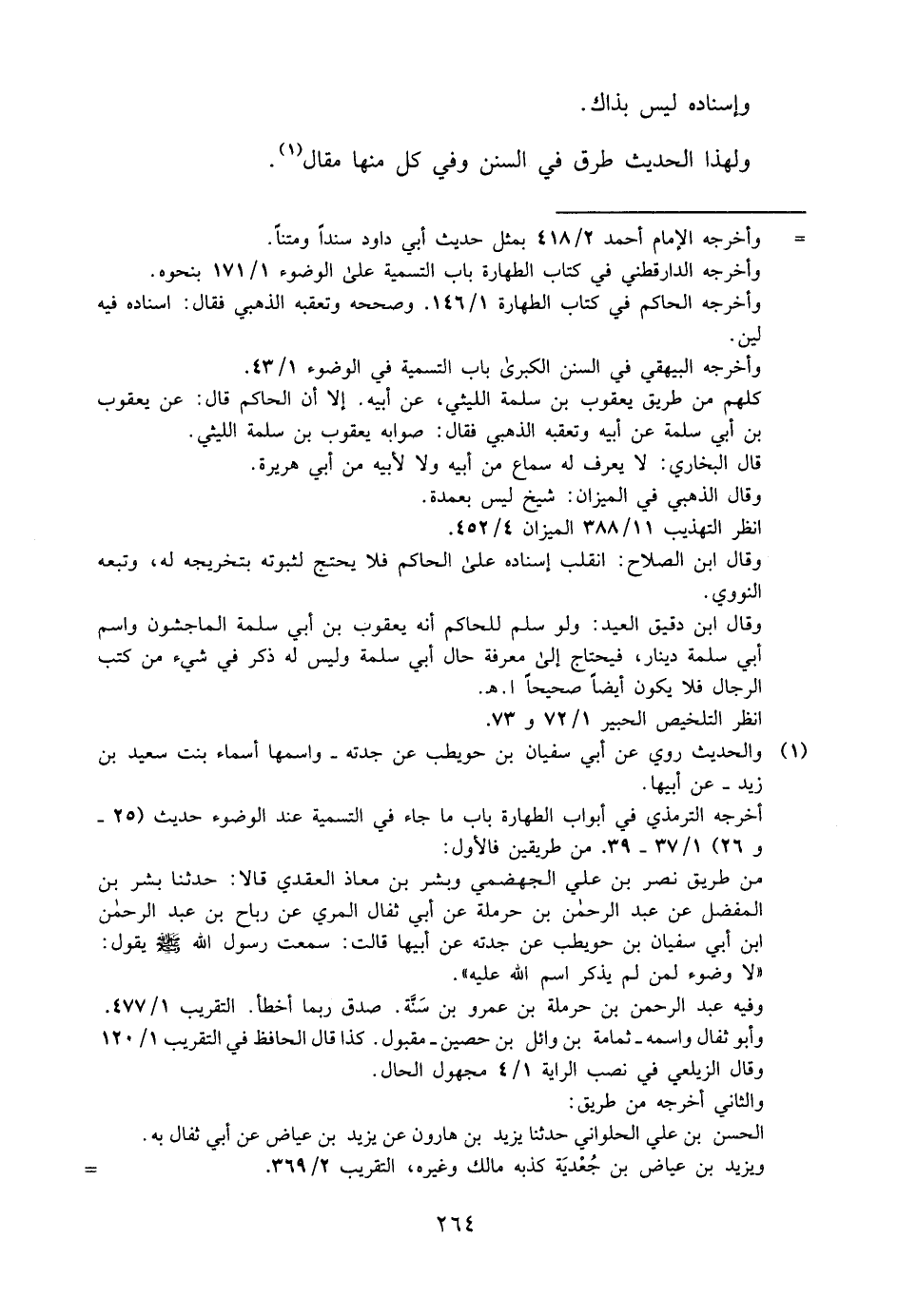 من طريق نصر بن علي الجهضمي وبشر بن معاذ العقدي قالا: حدثنا بشر بن المفضل عن عبد الرحمن بن حرملة عن أبي ثفال المري, عن رباح بن عبد الرحمن بن أبي سفيان بن حويطب, عن جدته عن أبيها قالت: سمعت رسول الله -صلى الله عليه وسلم- يقول: "لا وضوء لمن لم يذكر اسم الله عليه".