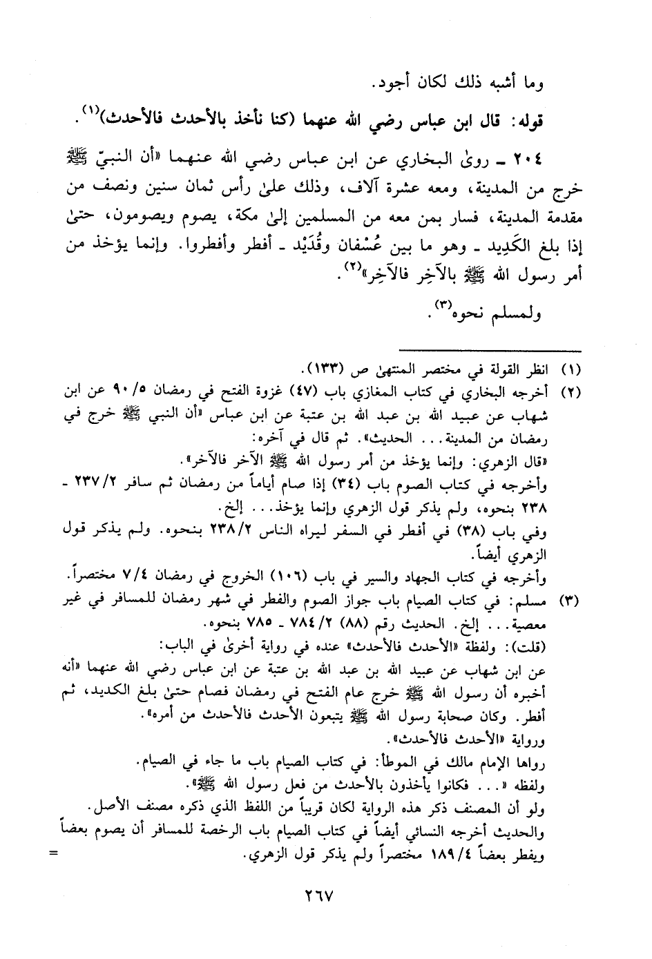 204- روى البخاري عن ابن عباس, رضي الله عنهما "أن النبي -صلى الله عليه وسلم- خرج من المدينة ومعه عشرة آلاف، وذلك على رأس ثماني سنين ونصف من مقدمه المدينة، فسار بمن معه من المسلمين إلى مكة، يصوم ويصومون, حتى إذا بلغ الكديد -وهو ما بين عسفان وقديد- أفطر وأفطروا. وإنما يؤخذ من أمر رسول الله -صلى الله عليه وسلم- بالآخر فالآخر"2.
