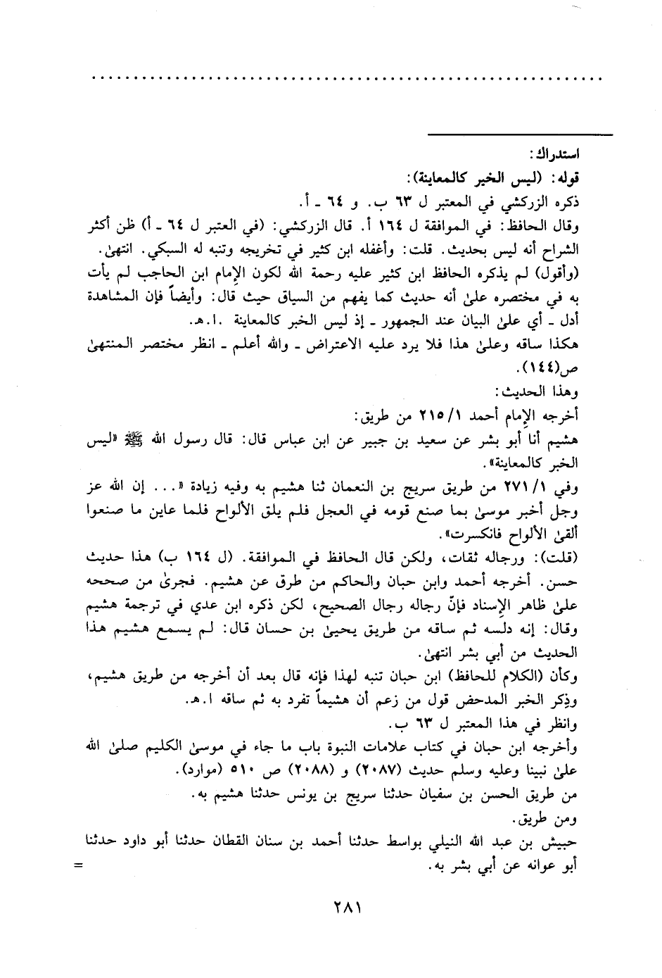 وقال الحافظ في الموافقة ل164 أ: قال الزركشي في المعتبر ل64 أ": ظن أكثر الشراح أنه ليس بحديث. قلت: وأغفله ابن كثير في تخريجه وتنبه له السبكي, انتهى.