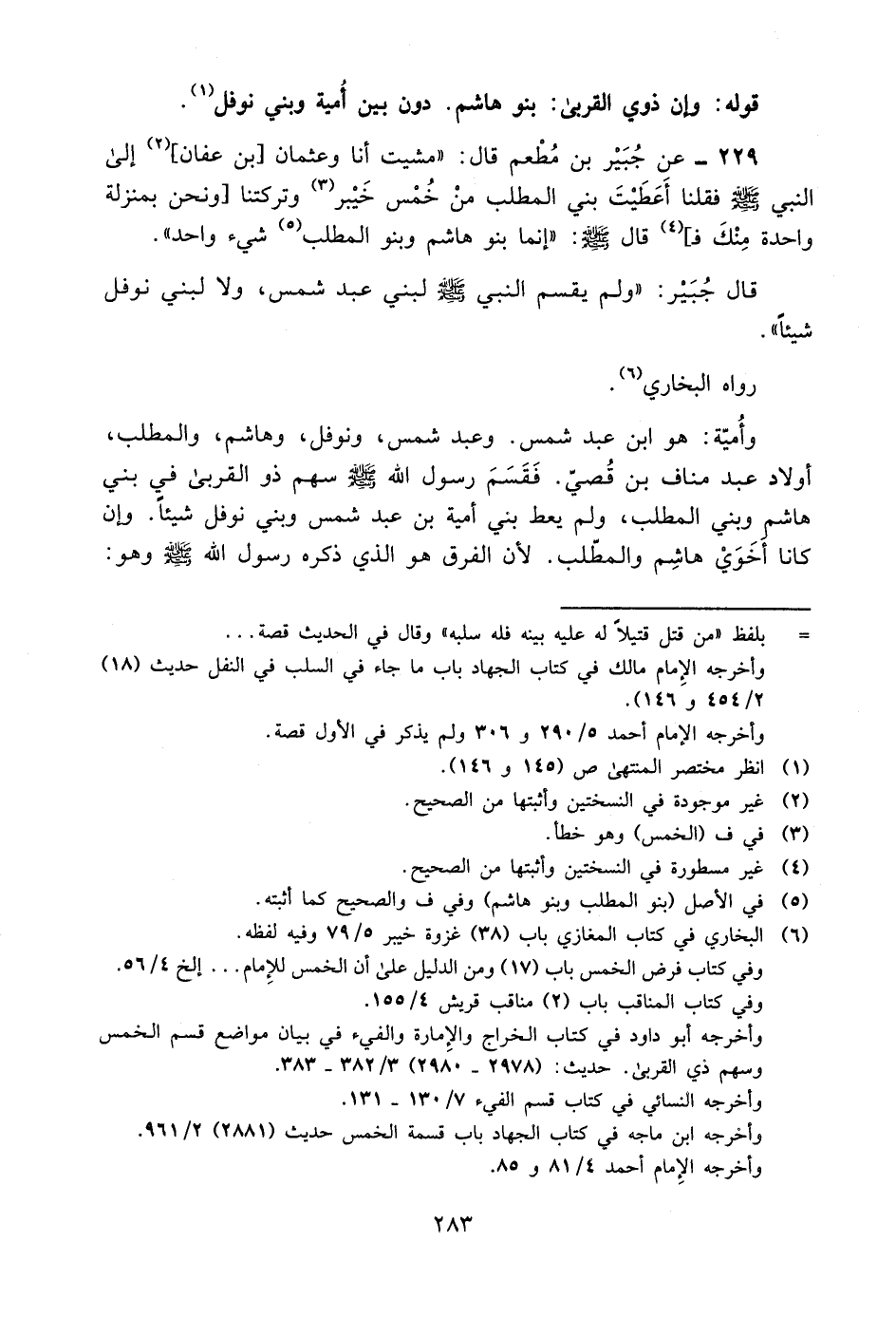 229- عن جبير بن مطعم قال: "مشيت أنا وعثمان [بن عفان] 2 إلى النبي -صلى الله عليه وسلم- فقلنا: أعطيت بني المطلب من خمس خيبر3 وتركتنا [ونحن بمنزلة واحدة منك! فـ] 4 قال صلى الله عليه وسلم: "إنما بنو هاشم وبنو المطلب 5 شيء واحد" ".
