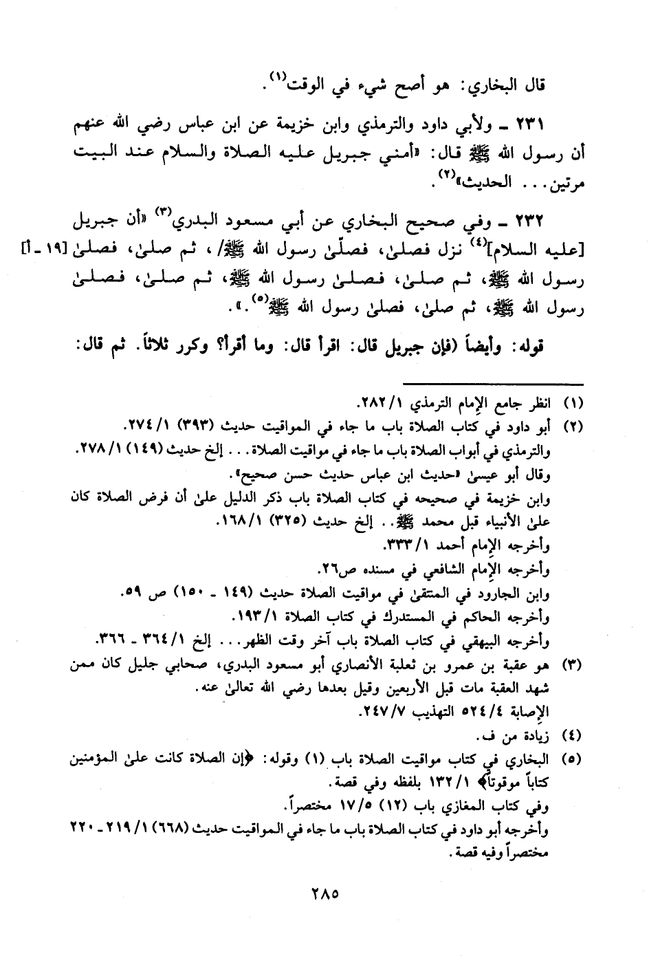 232- وفي صحيح البخاري عن أبي مسعود البدري3 "أن جبريل [عليه السلام] 4 نزل فصلى، فصلى رسول الله صلى الله عليه وسلم ثم صلى، فصلى رسول الله صلى الله عليه وسلم، ثم صلى، فصلى رسول الله صلى الله عليه وسلم، ثم صلى، فصلى رسول الله صلى الله عليه وسلم، ثم صلى، فصلى رسول الله صلى الله عليه وسلم5".