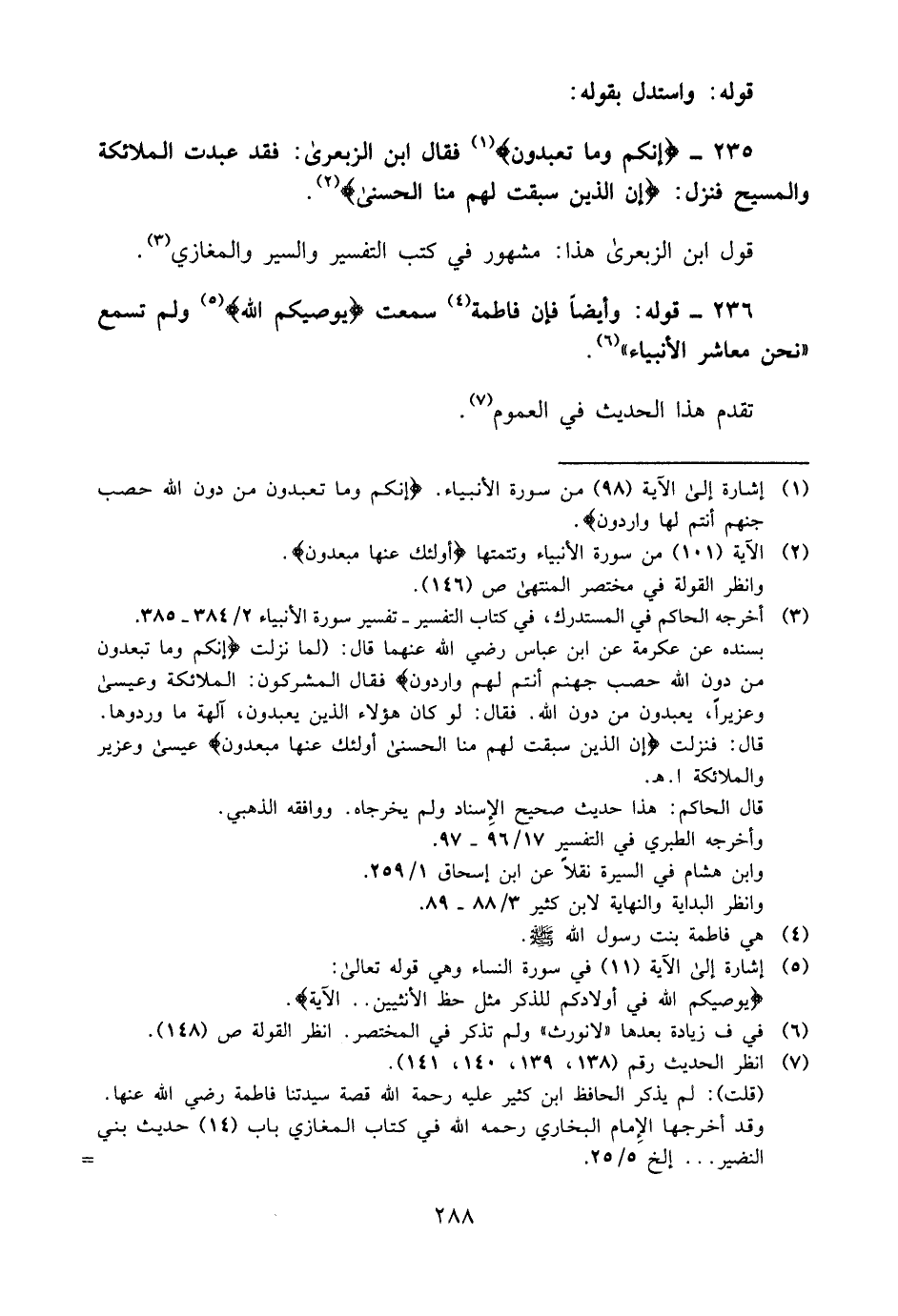 235- {إِنَّكُمْ وَمَا تَعْبُدُونَ} 1 فقال ابن الزبعرى: فقد عبدت الملائكة والمسيح, فنزل: {إِنَّ الَّذِينَ سَبَقَتْ لَهُمْ مِنَّا الْحُسْنَى} 2.