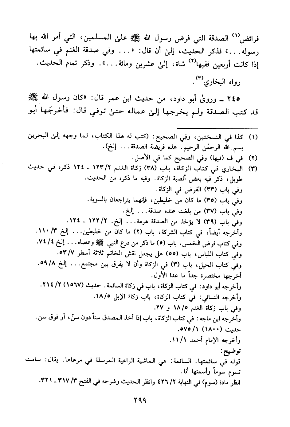 فرائض1 الصدقة التي فرض رسول الله -صلى الله عليه وسلم- على المسلمين, التي أمر الله بها رسوله ... " فذكر الحديث، إلى أن قال: " ... وفي صدقة الغنم في سائمتها إذا كانت أربعين ففيها 2 شاة، إلى عشرين ومائة ... " وذكر تمام الحديث.