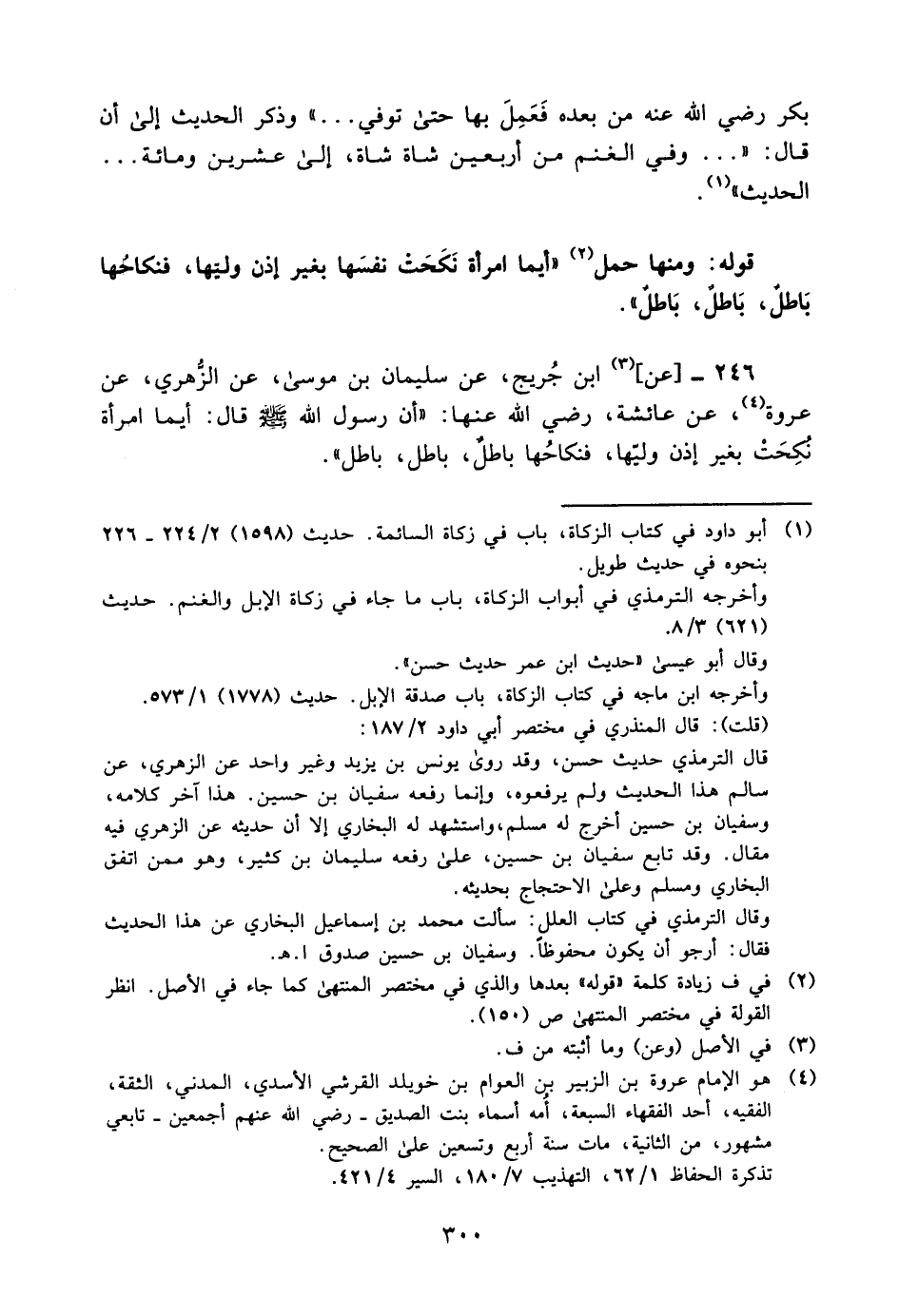 246-[عن] 3 ابن جريج، عن سليمان بن موسى، عن الزهري، عن عروة4، عن عائشة، رضي الله عنها: "أن رسول الله -صلى الله عليه وسلم- قال: "أيما امرأة نكحت بغير إذن وليها، فنكاحها باطل، باطل، باطل" ".