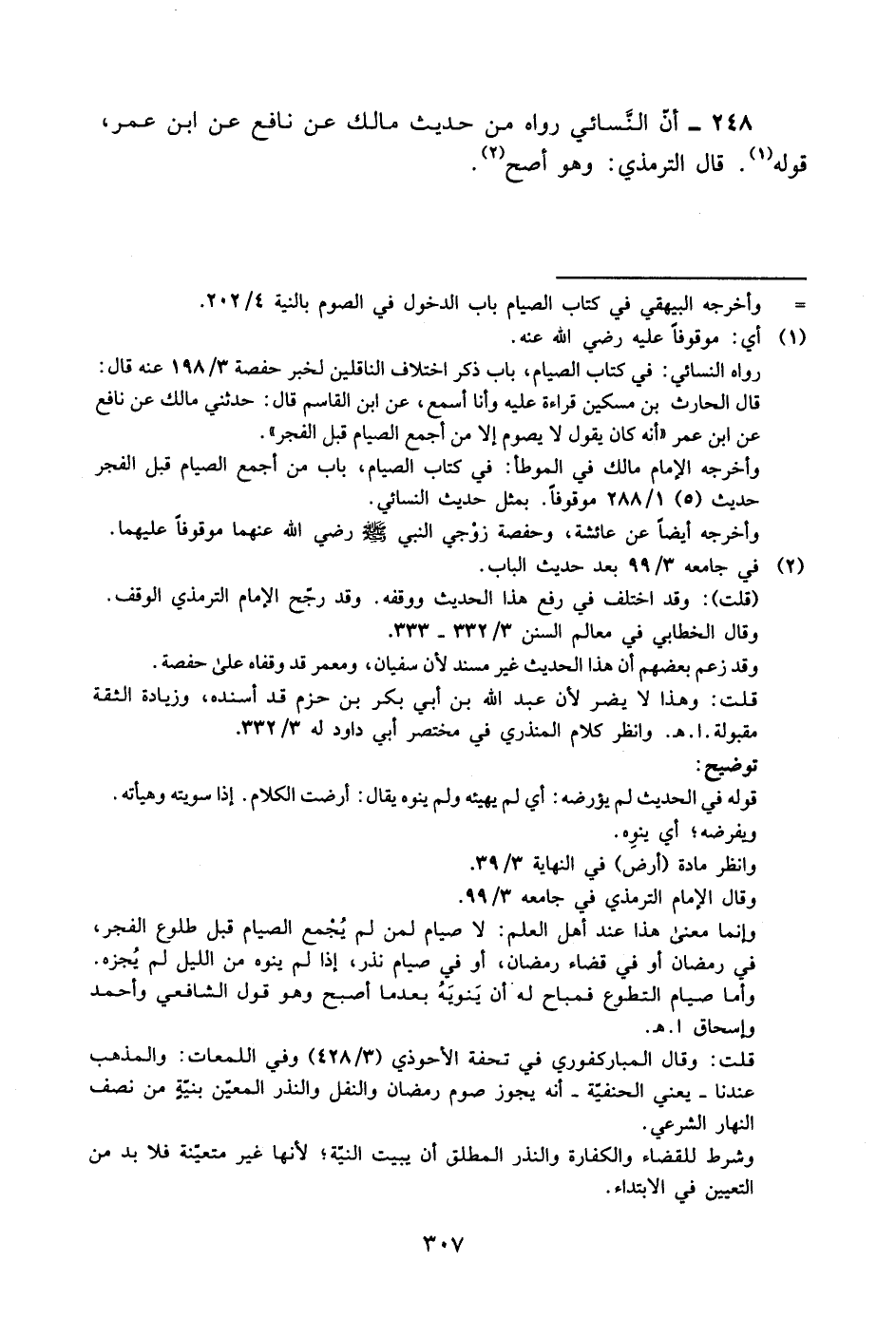 248- أن النسائي رواه من حديث مالك, عن نافع, عن ابن عمر، قوله1. قال الترمذي: وهو أصح2.