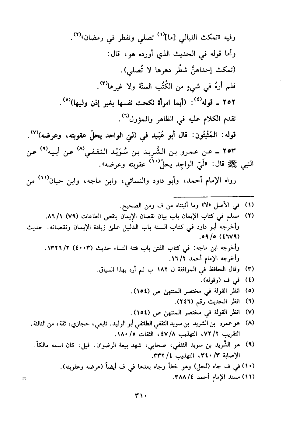 253- عن عمرو بن الشريد بن سويد الثقفي8 عن أبيه9, عن النبي -صلى الله عليه وسلم- قال: "لي الواجد يحل 10 عقوبته, وعرضه".