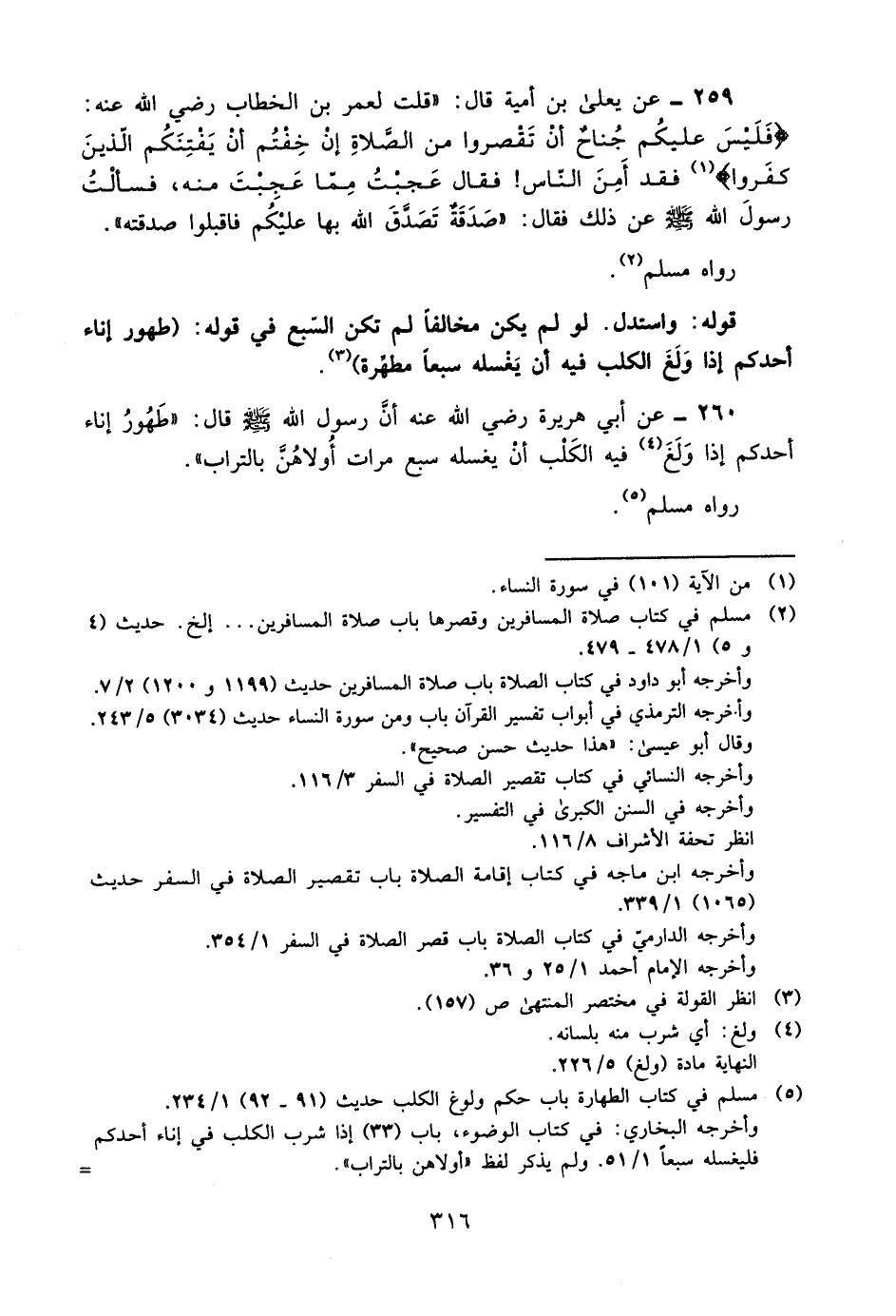 259- عن يعلى بن أمية قال: "قلت لعمر بن الخطاب, رضي الله عنه: {فَلَيْسَ عَلَيْكُمْ جُنَاحٌ أَنْ تَقْصُرُوا مِنَ الصَّلَاةِ إِنْ خِفْتُمْ أَنْ يَفْتِنَكُمُ الَّذِينَ كَفَرُوا} 1 فقد أمن الناس! فقال: عجبت مما عجبت منه، فسألت رسول الله -صلى الله عليه وسلم- عن ذلك فقال: "صدقة تصدق الله بها عليكم, فاقبلوا صدقته" ".