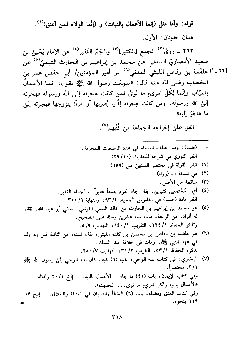 262- روى2 الجمع [الكثير] 3 والجمّ الغفير4 عن الإمام يحيى بن سعيد الأنصاري المدني, عن محمد بن إبراهيم بن الحارث التيمي5, عن علقمة بن وقاص الليثي المدني6, عن أمير المؤمنين أبي حفص عمر بن الخطاب -رضي الله عنه- قال: "سمعت رسول الله -صلى الله عليه وسلم- يقول: "إنما الأعمال بالنيات, وإنما لكل امرئ ما نوى؛ فمن كانت هجرته إلى الله ورسوله فهجرته إلى الله ورسوله، ومن كانت هجرته لدنيا يصيبها أو امرأة يتزوجها, فهجرته إلى ما هاجر إليه".