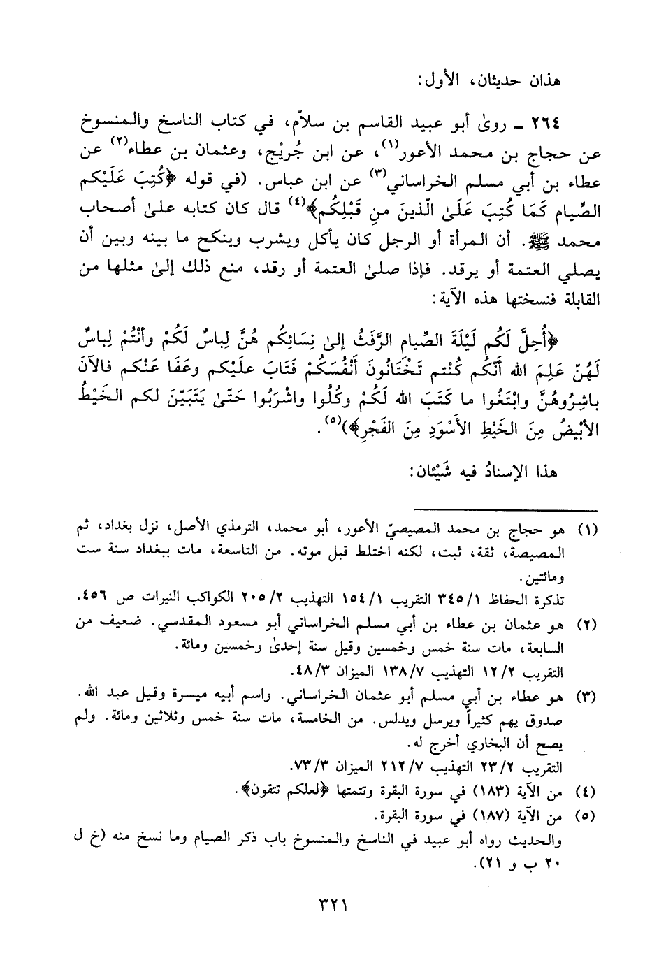 264- روى أبو عبيد القاسم بن سلام، في كتاب الناسخ والمنسوخ, عن حجاج بن محمد الأعور1، عن ابن جريج، وعثمان بن عطاء2, عن عطاء بن أبي مسلم الخراساني3 عن ابن عباس في قوله: {كُتِبَ عَلَيْكُمُ الصِّيَامُ كَمَا كُتِبَ عَلَى الَّذِينَ مِنْ قَبْلِكُمْ} 4 قال: كان كتابه على أصحاب محمد -صلى الله عليه وسلم- أن المرأة أو الرجل كان يأكل ويشرب وينكح ما بينه وبين أن يصلي العتمة أو يرقد. فإذا صلى العتمة أو رقد، منع ذلك إلى مثلها من القابلة, فنسختها هذه الآية: