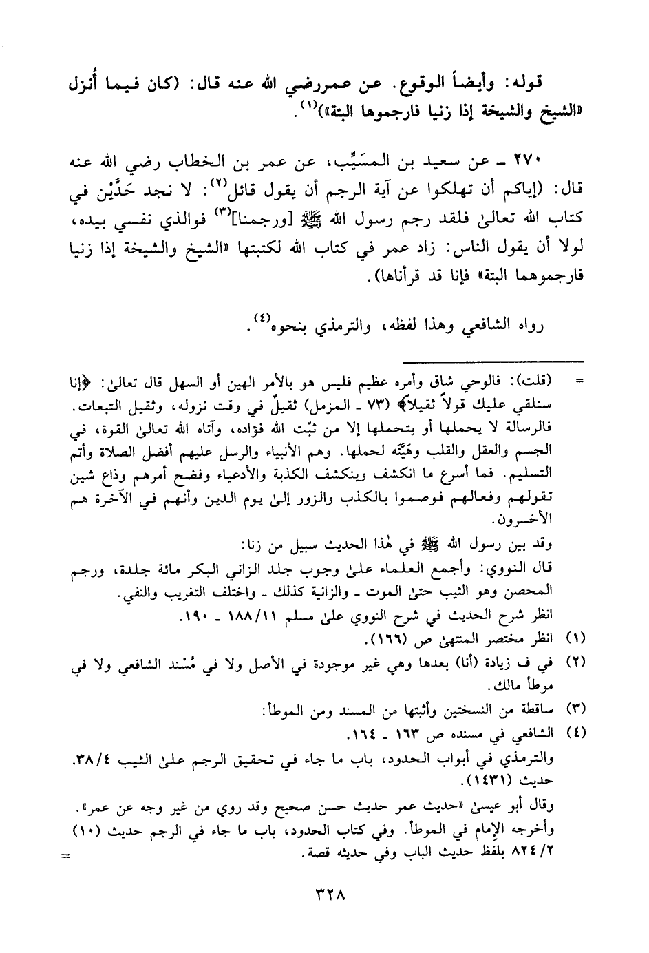 270- عن سعيد بن المسيب، عن عمر بن الخطاب -رضي الله عنه- قال: "إياكم أن تهلكوا عن آية الرجم أن يقول قائل2: لا نجد حدين في كتاب الله تعالى؛ فلقد رجم رسول الله -صلى الله عليه وسلم-[ورجمنا] 3. فوالذي نفسي بيده، لولا أن يقول الناس: زاد عمر في كتاب الله لكتبتها: "الشيخ والشيخة إذا زنيا فارجموهما البتة" فإنا قد قرأناها".