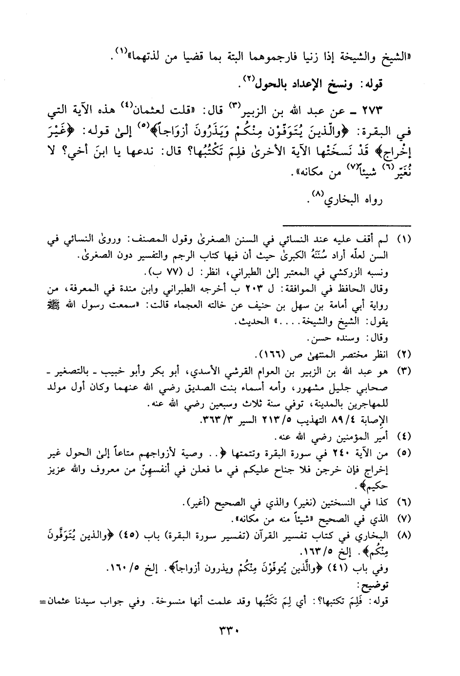 273- عن عبد الله بن الزبير3 قال: "قلت لعثمان4: هذه الآية التي في البقرة: {وَالَّذِينَ يُتَوَفَّوْنَ مِنْكُمْ وَيَذَرُونَ أَزْوَاجًا} 5 إلى قوله: {غَيْرَ إِخْرَاجٍ} قد نسختها الآية الأخرى, فلِمَ تكتبها؟ قال: ندعها يابن أخي, لا نغير6 شيئا7 من مكانه".