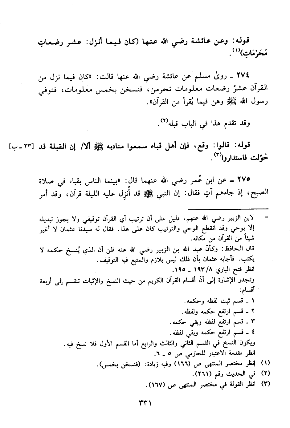 274- روى مسلم عن عائشة -رضي الله عنها- قالت: "كان فيما نزل من القرآن: عشر رضعات معلومات تحرمن، فنسخن بخمس معلومات، فتوفي رسول الله -صلى الله عليه وسلم- وهن فيما يُقرأ من القرآن".