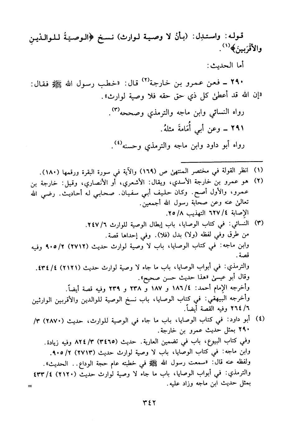 290- فعن عمرو بن خارجة2 قال: "خطب رسول الله -صلى الله عليه وسلم- فقال: "إن الله قد أعطى كل ذي حق حقه, فلا وصية لوارث" ".