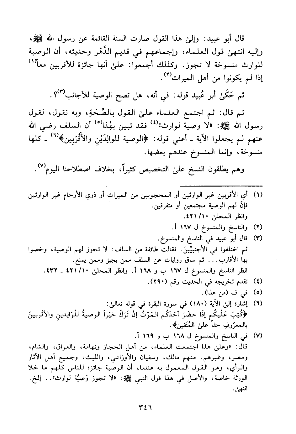 قال أبو عبيد: وإلى هذا القول صارت السنة القائمة عن رسول الله صلى الله عليه وسلم، وإليه انتهى قول العلماء، وإجماعهم في قديم الدهر وحديثه، أن الوصية للوارث منسوخة لا تجوز. وكذلك أجمعوا على أنها جائزة للأقربين معا1, إذا لم يكونوا من أهل الميراث2.