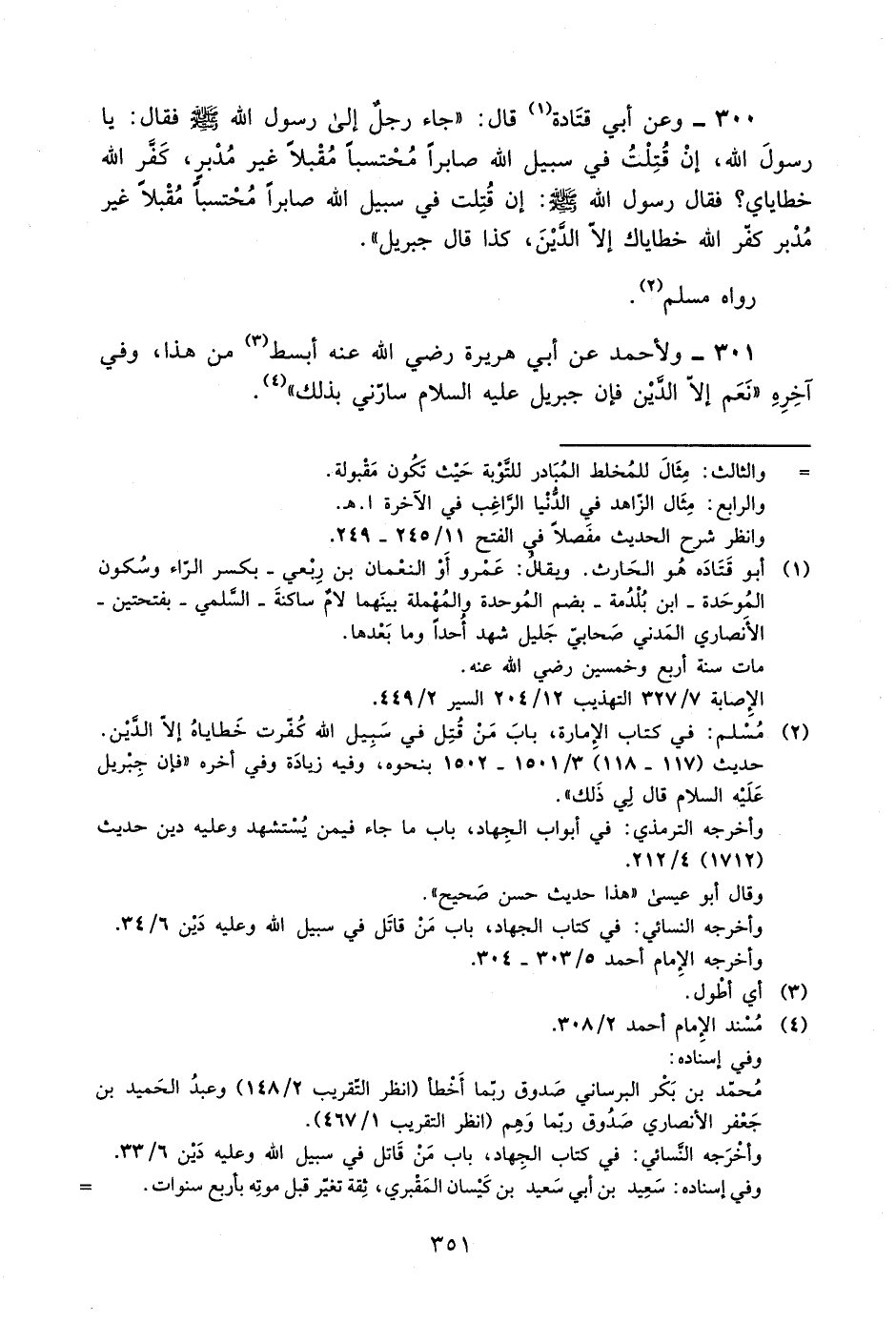 300- وعن أبي قتادة1 قال: "جاء رجل إلى رسول الله -صلى الله عليه وسلم- فقال: يا رسول الله، إن قُتلت في سبيل الله صابرا محتسبا مقبلا غير مدبر، كَفَّر الله خطاياي؟ فقال رسول الله صلى الله عليه وسلم: "إن قتلت في سبيل الله صابرا محتسبا مقبلا غير مدبر, كفر الله خطاياك إلا الدَّيْن، كذا قال جبريل" ".