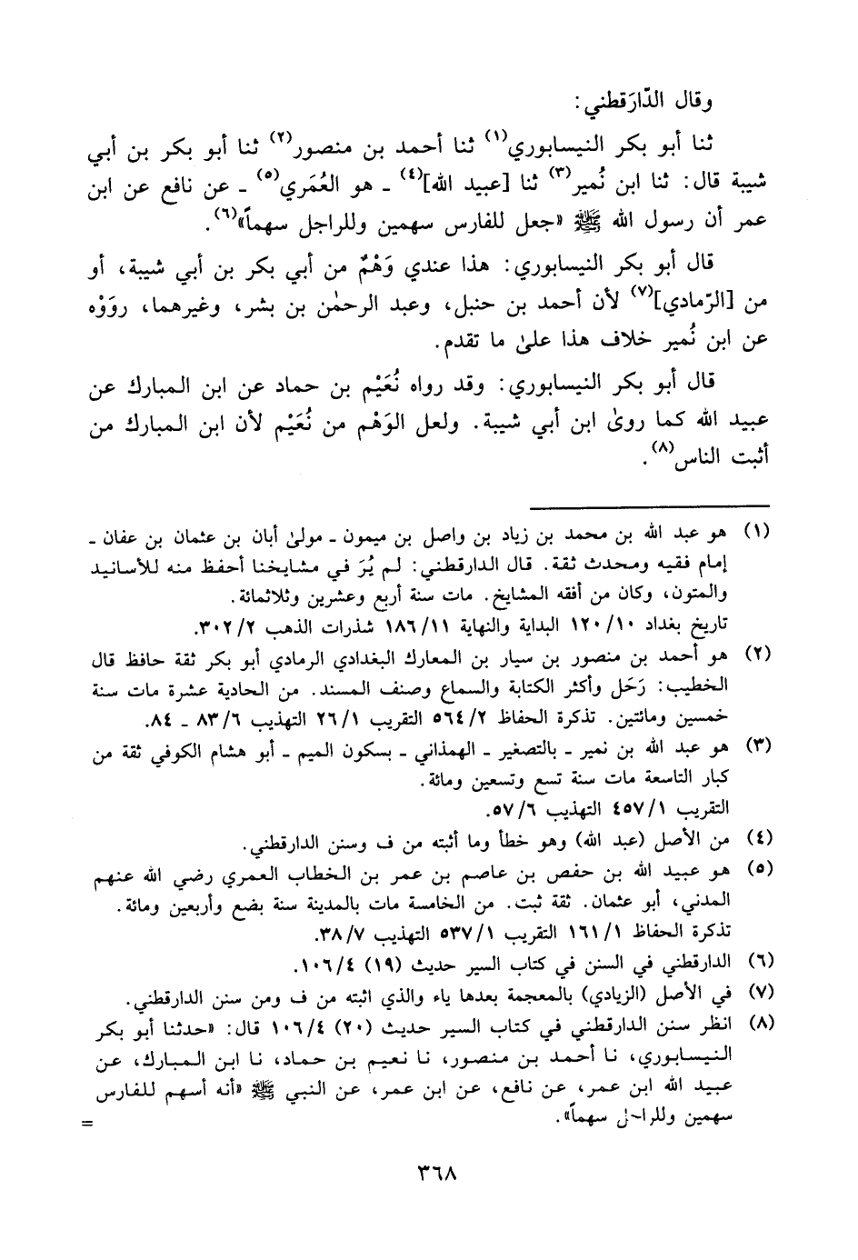 8 انظر سنن الدارقطني, في كتاب السير, حديث "20" 4/ 106 قال: "حدثنا أبو بكر النيسابوري، نا أحمد بن منصور، نا نعيم بن حماد، نا ابن المبارك، عن عبيد الله بن عمر، عن نافع، عن ابن عمر، عن النبي صلى الله عليه وسلم "أنه أسهم للفارس سهمين, وللراحل سهما". =