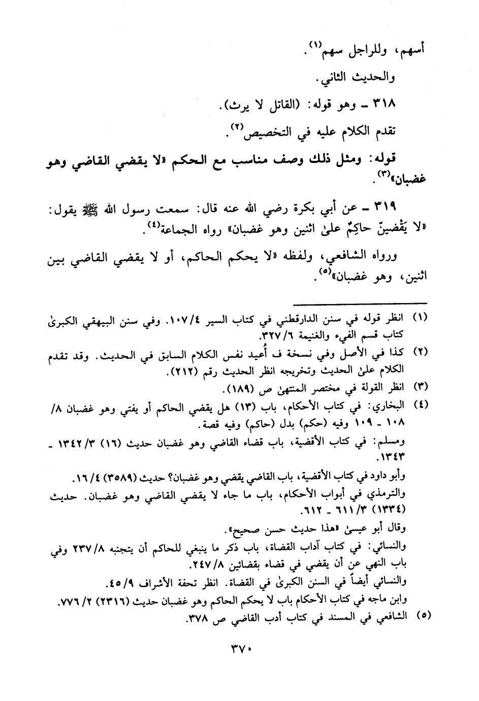 319- عن أبي بكرة -رضي الله عنه- قال: سمعت رسول الله -صلى الله عليه وسلم- يقول: "لا يقضين حاكم على اثنين, وهو غضبان" رواه الجماعة4.