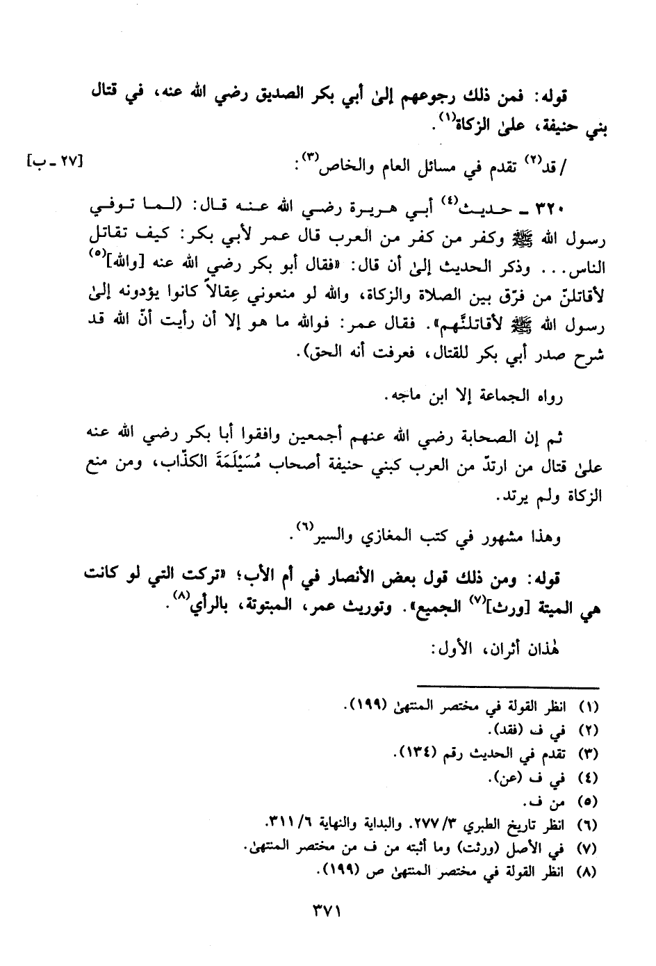 320- حديث4 أبي هريرة -رضي الله عنه- قال: "لما توفي رسول الله -صلى الله عليه وسلم- وكفر من كفر من العرب, قال عمر لأبي بكر: كيف تقاتل الناس ... وذكر الحديث, إلى أن قال: "فقال أبو بكر رضي الله عنه: [والله] 5 لأقاتلن من فرّق بين الصلاة والزكاة، والله لو منعوني عقالا كانوا يؤدونه إلى رسول الله -صلى الله عليه وسلم- لأقاتلنّهم". فقال عمر: فوالله, ما هو إلا أن رأيت أن الله قد شرح صدر أبي بكر للقتال، فعرفت أنه الحق".