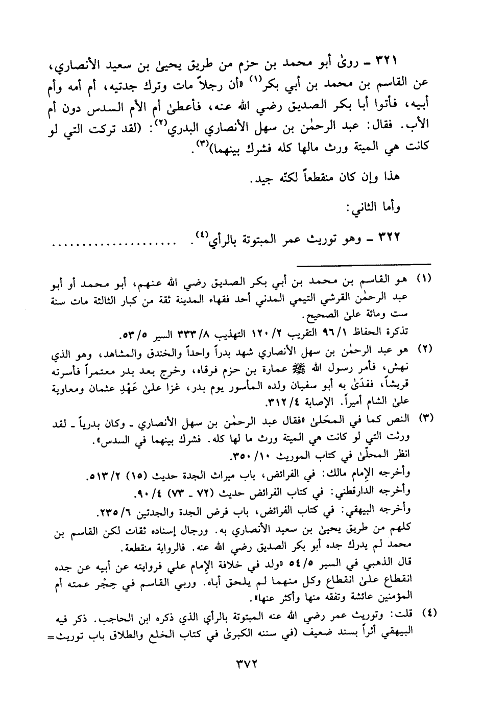 321- روى أبو محمد بن حزم من طريق يحيى بن سعيد الأنصاري، عن القاسم بن محمد بن أبي بكر1 "أن رجلا مات وترك جدتيه؛ أم أمه وأم أبيه، فأتوا أبا بكر الصديق -رضي الله عنه- فأعطى أم الأم السدس دون أم الأب. فقال عبد الرحمن بن سهل الأنصاري البدري2: "لقد تركت التي لو كانت هي الميتة ورث مالها كله, فشرك بينهما""3.
