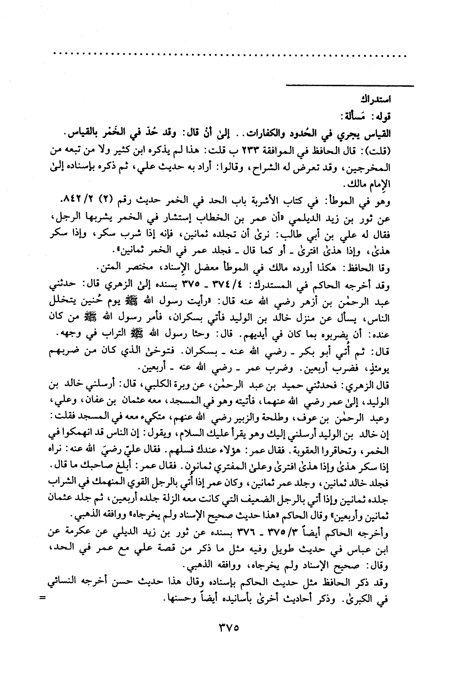 قال الزهري: فحدثني حميد بن عبد الرحمن, عن وبرة الكلبي، قال: أرسلني خالد بن الوليد إلى عمر رضي الله عنهما، فأتيته وهو في المسجد معه عثمان بن عفان، وعلي, وعبد الرحمن بن عوف، طلحة, والزبير -رضي الله عنهم- متكئ معه في المسجد, فقلت: إن خالد بن الوليد أرسلني إليك وهو يقرئ عليك السلام، ويقول: إن الناس قد انهمكوا في الخمر وتحاقروا العقوبة, فقال عمر: هؤلاء عندك فسلهم. فقال علي رضي الله عنه: نراه إذا سكر هذى وإذا هذى افترى, وعلى المفتري ثمانون, فقال عمر: أبلغ صاحبك ما قال. فجلد خالد ثمانين، وجلد عمر ثمانين، وكان عمر إذا أتي بالرجل القوي المنهمك في الشراب جلده ثمانين, وإذا أتي بالرجل الضعيف التي كانت معه الزلة جلده أربعين، ثم جلد عثمان ثمانين وأربعين. وقال الحاكم: "هذا حديث صحيح الإسناد ولم يخرجاه" ووافقه الذهبي.