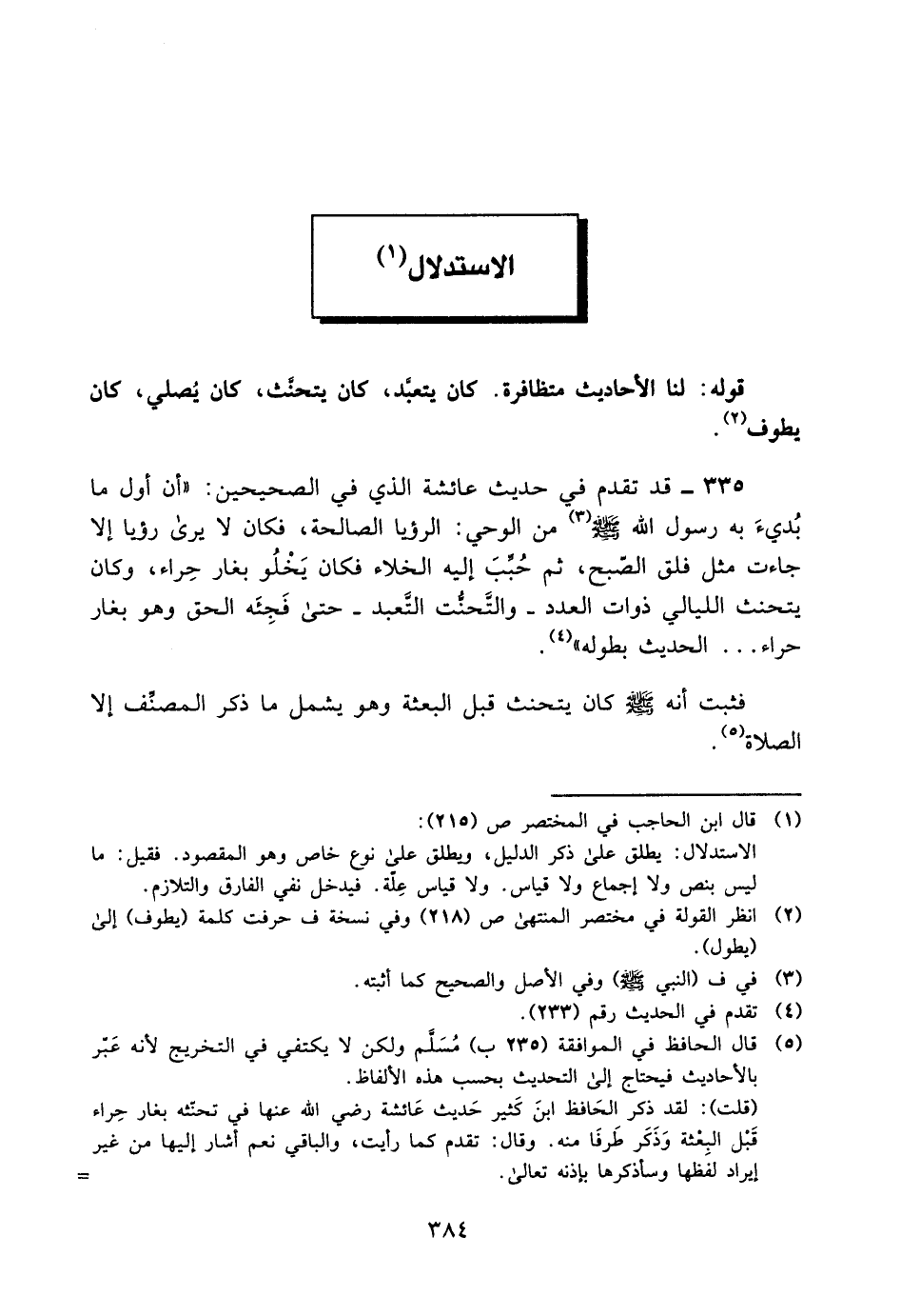 335- قد تقدم في حديث عائشة الذي في الصحيحين: "أن أول ما بدئ به رسول الله -صلى الله عليه وسلم3- من الوحي: الرؤيا الصالحة، فكان لا يرى رؤيا إلا جاءت مثل فلق الصبح، ثم حُبِّب إليه الخلاء, فكان يخلو بغار حراء، وكان يتحنث الليالي ذوات العدد -والتحنث: التعبد- حتى فجئه الحق وهو بغار حراء ... الحديث بطوله"4.