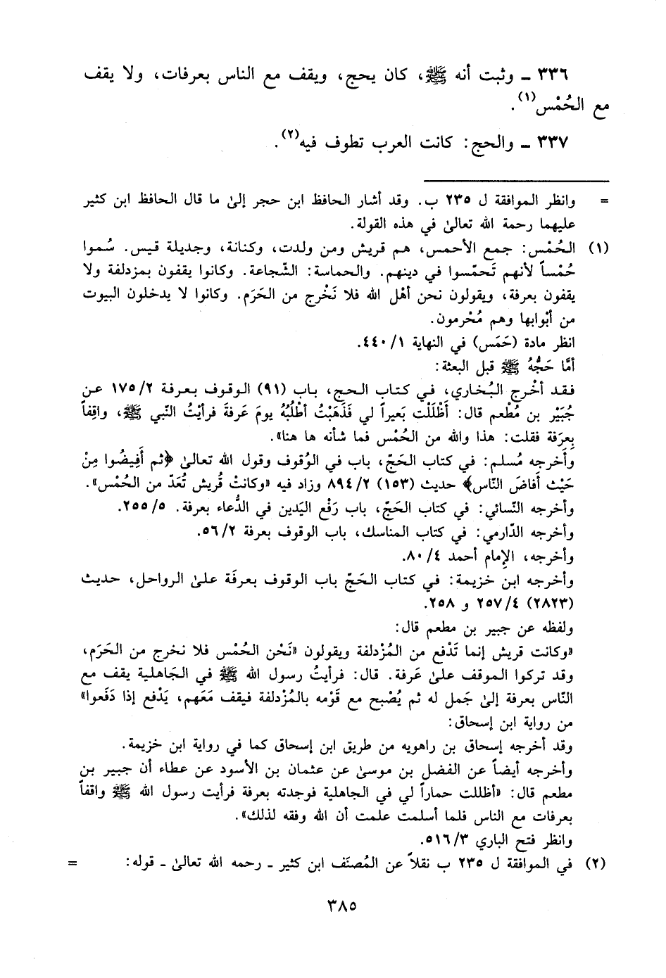 336- وثبت أنه -صلى الله عليه وسلم- كان يحج، ويقف مع الناس بعرفات، ولا يقف مع الحُمْس1.