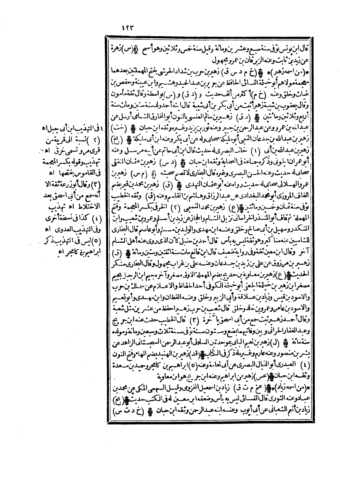 (خَ م د س ق) زُهَيْر بن حَرْب بن شَدَّاد الْحَرَشِي بِفَتْح الْمُهْمَلَتَيْنِ بعدهمَا مُعْجمَة مَوْلَاهُم أَبُو خَيْثَمَة النَّسَائِيّ الْحَافِظ عَن جرير عَن عبد الحميد وهشيم وَابْن عُيَيْنَة وَحَفْص بن غياث وَخلق وَعنهُ (خَ م) أَكثر من ألف حَدِيث و (د ق) و (س) بِوَاسِطَة وَقَالَ ثِقَة مَأْمُون وَقَالَ يَعْقُوب بن شيبَة زُهَيْر أثبت من أبي بكر بن أبي شيبَة قَالَ ابْنه أَحْمد ولد سنة سِتِّينَ وَمَات سنة أَربع وَثَلَاثِينَ وَمِائَتَيْنِ