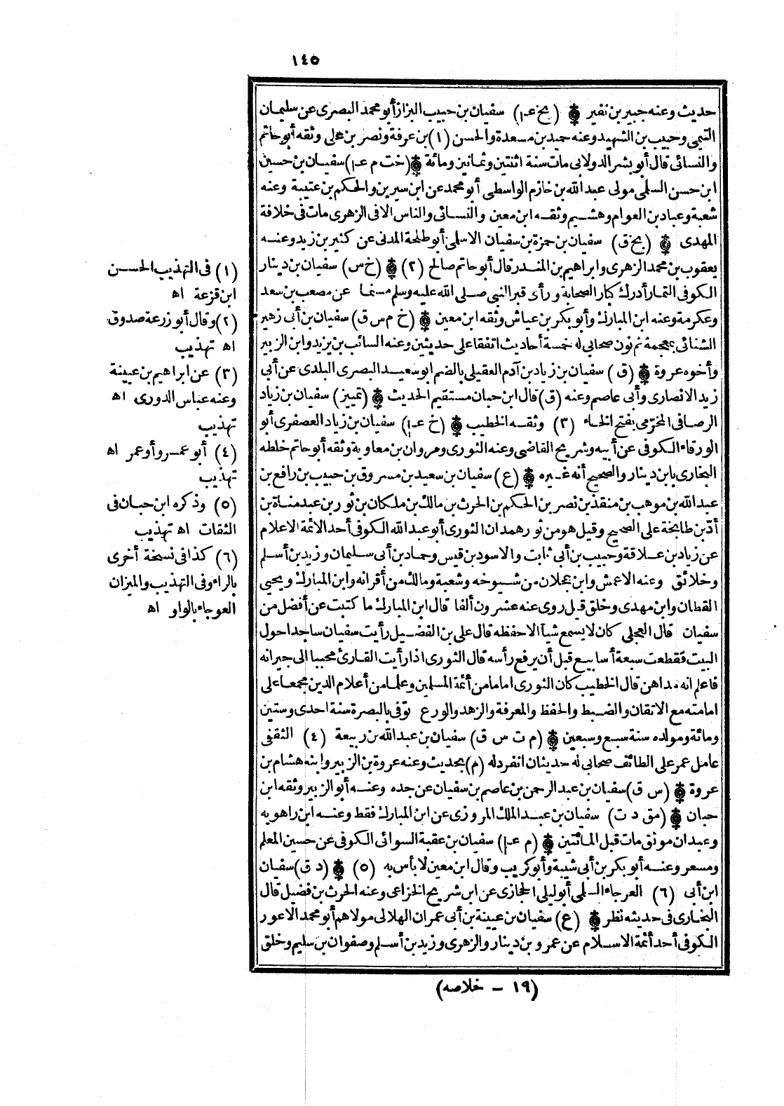 (ع) سُفْيَان بن سعيد بن مَسْرُوق بن حبيب بن رَافع بن عبد الله بن موهب بن منقذ بن نصر بن الحكم بن الْحَرْث بن مَالك بن ملكان بن ثَوْر بن عبد مَنَاة بن أد بن طابخة على الصَّحِيح وَقيل هُوَ من نور هَمدَان الثَّوْريّ أَبُو عبد الله الْكُوفِي أحد الْأَئِمَّة الْأَعْلَام عَن زِيَاد بن علاقَة وحبِيب بن أبي ثَابت وَالْأسود بن قيس وَحَمَّاد بن أبي سُلَيْمَان وَزيد بن أسلم وخلائق وَعنهُ الْأَعْمَش وَابْن عجلَان من شُيُوخه وَشعْبَة وَمَالك من أقرانه وَابْن الْمُبَارك وَيحيى الْقطَّان وَابْن مهْدي وَخلق قيل روى عَنهُ عشرُون ألفا قَالَ ابْن الْمُبَارك مَا كتبت عَن أفضل من سُفْيَان قَالَ الْعجلِيّ كَانَ لَا يسمع شَيْئا إِلَّا حفظه قَالَ عَليّ بن الفضيل رَأَيْت سُفْيَان سَاجِدا حول الْبَيْت فَقطعت سَبْعَة أسابيع قبل أَن يرفع رَأسه قَالَ الثَّوْريّ إِذا رَأَيْت القارىء محببا إِلَى جِيرَانه فَاعْلَم أَنه مداهن قَالَ الْخَطِيب كَانَ الثَّوْريّ إِمَامًا من أَئِمَّة الْمُسلمين وعلما من أَعْلَام الدّين مجمعا على إِمَامَته مَعَ الإتقان والضبط وَالْحِفْظ والمعرفة والزهد والورع توفّي بِالْبَصْرَةِ سنة إِحْدَى وَسِتِّينَ وَمِائَة ومولده سنة سبع وَسبعين