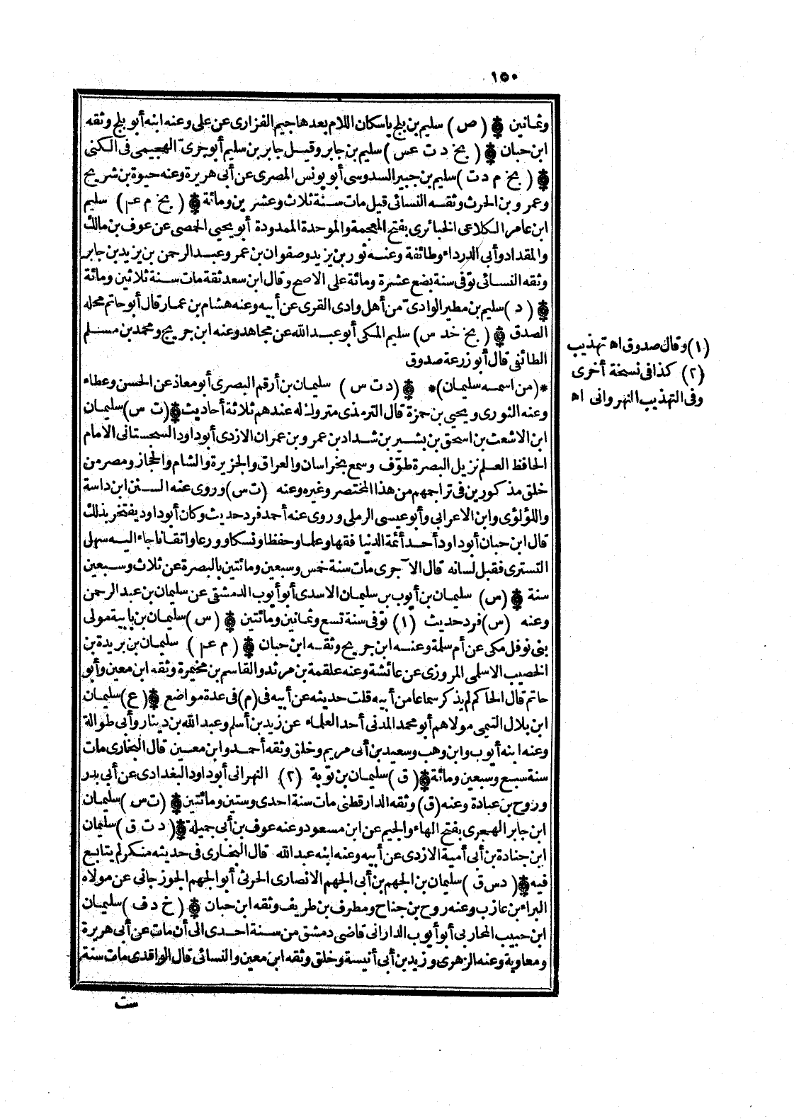 (ت س) سُلَيْمَان ابْن الْأَشْعَث بن إِسْحَاق بن بشير بن شَدَّاد بن عَمْرو بن عمرَان الْأَزْدِيّ أَبُو دَاوُد السجسْتانِي الإِمَام الْحَافِظ الْعلم نزيل الْبَصْرَة طوف وَسمع بخراسان وَالْعراق والجزيرة وَالشَّام والحجاز ومصر من خلق مذكورين فِي تراجمهم من هَذَا الْمُخْتَصر وَغَيره وَعنهُ (ت س) وروى عَنهُ السّنَن ابْن داسة واللؤلؤي وَابْن الْأَعرَابِي وَأَبُو عِيسَى الرَّمْلِيّ وروى عَنهُ أَحْمد فَرد حَدِيث وَكَانَ أَبُو دَاوُد يفتخر بذلك قَالَ ابْن حبَان أَبُو دَاوُد أحد أَئِمَّة الدُّنْيَا فقها وعلما وحفظا ونسكا وورعا واتقانا جَاءَ إِلَيْهِ سهل التسترِي فَقبل لِسَانه قَالَ الْآجُرِيّ مَاتَ سنة خمس وَسبعين وَمِائَتَيْنِ بِالْبَصْرَةِ عَن ثَلَاث وَسبعين سنة