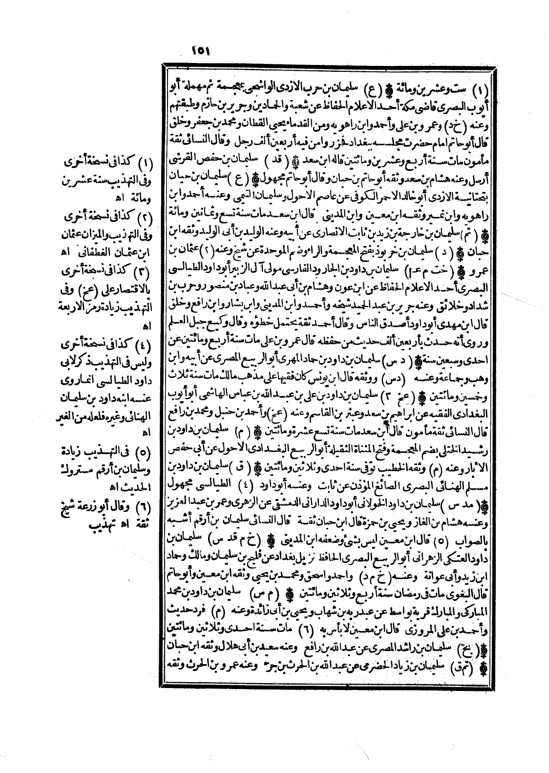 (ع) سُلَيْمَان بن حَرْب الْأَزْدِيّ الواشجي بِمُعْجَمَة ثمَّ مُهْملَة أَبُو أَيُّوب الْمصْرِيّ قَاضِي مَكَّة أحد الْأَعْلَام الْحفاظ عَن شُعْبَة والحمادين وَجَرِير بن حَازِم وطبقتهم وَعنهُ (خَ د) وَعَمْرو بن عَليّ وَأحمد وَابْن رَاهَوَيْه وَمن القدماء يحيى الْقطَّان وَمُحَمّد بن جَعْفَر وَخلق قَالَ أَبُو حَاتِم إِمَام حضرت مَجْلِسه بِبَغْدَاد فحزروا من فِيهِ أَرْبَعِينَ ألف رجل وَقَالَ النَّسَائِيّ ثِقَة مَأْمُون مَاتَ سنة أَربع وَعشْرين وَمِائَتَيْنِ قَالَه ابْن سعد