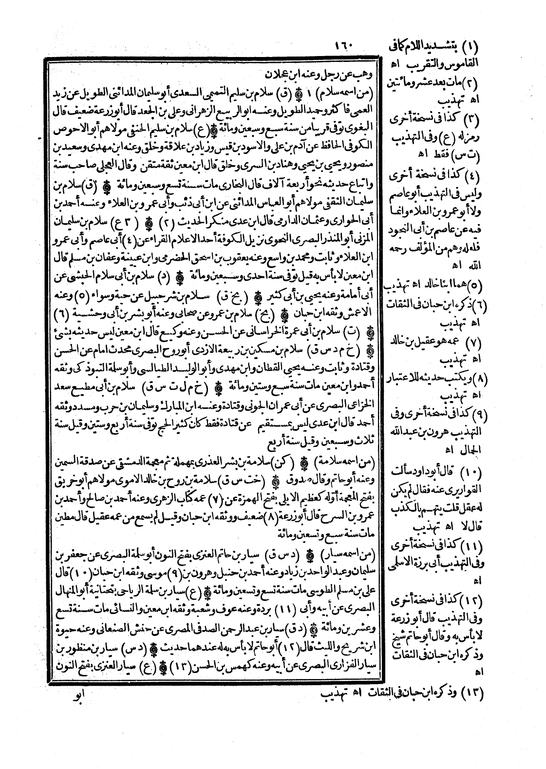 (ع) سَلام بن سليم الْحَنَفِيّ مَوْلَاهُم أَبُو الْأَحْوَص الْكُوفِي الْحَافِظ عَن آدم بن عَليّ وَالْأسود بن قيس وَزِيَاد بن علاقَة وَخلق وَعنهُ ابْن مهْدي وَسَعِيد بن مَنْصُور وَيحيى بن يحيى وهناد بن السّري وَخلق قَالَ ابْن معِين ثِقَة متقن وَقَالَ الْعجلِيّ صَاحب سنة وَأَتْبَاع حَدِيثه نَحْو أَرْبَعَة آلَاف قَالَ البُخَارِيّ مَاتَ سنة تسع وَسبعين وَمِائَة