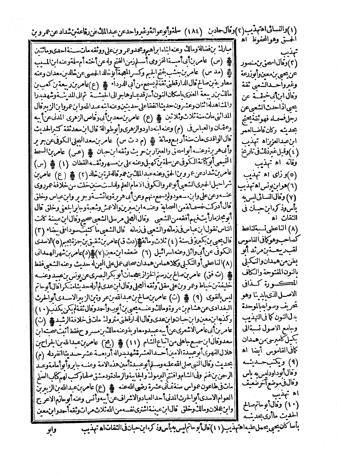 (ع) عَامر بن شرَاحِيل الْحِمْيَرِي الشّعبِيّ أَبُو عَمْرو الْكُوفِي الإِمَام الْعلم ولد لست سِنِين خلت من خلَافَة عمر روى عَنهُ وَعَن عَليّ وَابْن مَسْعُود وَلم يسمع مِنْهُم وَعَن أبي هُرَيْرَة وَعَائِشَة وَجَرِير وَابْن عَبَّاس وَخلق قَالَ أدْركْت خَمْسمِائَة من الصَّحَابَة وَعنهُ ابْن سِيرِين وَالْأَعْمَش وَشعْبَة وَجَابِر الْجعْفِيّ وَخلق قَالَ أَبُو مجلز مَا رَأَيْت فيهم أفقه من الشّعبِيّ وَقَالَ الْعجلِيّ مُرْسل الشّعبِيّ صَحِيح وَقَالَ ابْن عُيَيْنَة كَانَت النَّاس تَقول ابْن عَبَّاس فِي زَمَانه وَالشعْبِيّ فِي زَمَانه قَالَ الشّعبِيّ مَا كتبت سَوْدَاء فِي بَيْضَاء (3) قَالَ يحيى بن بكير توفّي سنة (4) ثَلَاث وَمِائَة