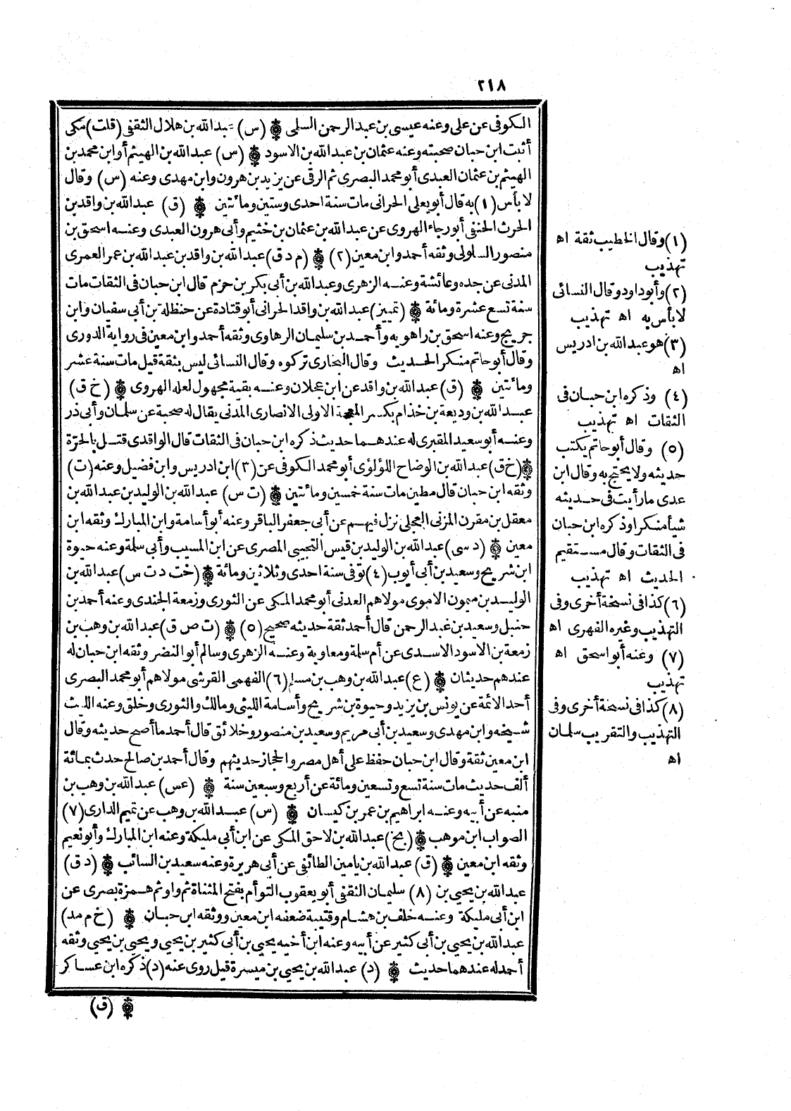 (ع) عبد الله بن وهب بن مُسلم (6) الفهمي الْقرشِي مَوْلَاهُم أَبُو مُحَمَّد الْبَصْرِيّ أحد الْأَئِمَّة عَن يُونُس بن يزِيد وحيوة بن شُرَيْح وَأُسَامَة اللَّيْثِيّ وَمَالك وَالثَّوْري وَخلق وَعنهُ اللَّيْث شَيْخه وَابْن مهْدي وَسَعِيد بن أبي مَرْيَم وَسَعِيد بن مَنْصُور وخلائق قَالَ أَحْمد مَا أصح حَدِيثه وَقَالَ ابْن معِين ثِقَة قَالَ ابْن حبَان حفظ على أهل مصر والحجاز حَدِيثهمْ وَقَالَ أَحْمد بن صَالح حدث بِمِائَة ألف حَدِيث مَاتَ سنة تسع وَتِسْعين وَمِائَة عَن أَربع وَسبعين سنة