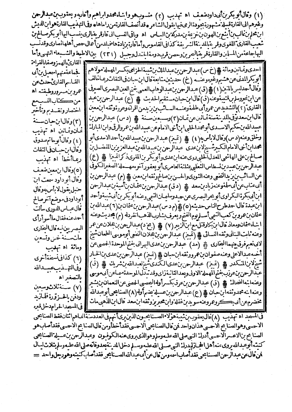 (8) قَالَ يَعْقُوب بن شيبَة هَؤُلَاءِ الصنابحيون الَّذين يرى أَنهم فِي الْعدَد سِتَّة انما هم اثْنَان فَقَط الصنَابحِي الأحمسي وَهُوَ الصنابح الأحمسي هَذَانِ وَاحِد فَمن قَالَ الصنَابحِي الأحمسي فقد أَخطَأ وَمن قَالَ الصنابح الأحمسى فقد أصَاب هُوَ الصنابح بن الأعسر الأحمسي أدْرك النَّبِي وَهُوَ الَّذِي يروي عَنهُ الْكُوفِيُّونَ وَعبد الرَّحْمَن بن عسيلة الصنَابحِي كنيته أَبُو عبد الله يروي عَنهُ أهل الْحجاز لم يدْرك النَّبِي دخل الْمَدِينَة بعد وَفَاته بِثَلَاث لَيَال فَمن قَالَ عَن عبد الرَّحْمَن الصنَابحِي فقد أصَاب اسْمه وَمن قَالَ عَن أبي عبد الله الصنَابحِي فقد أصَاب كنيته وَهُوَ رجل وَاحِد وَمن قَالَ عَن أبي عبد الرَّحْمَن الصنَابحِي فقد أَخطَأ قلب اسْمه فَجعل اسْمه كنيته وَمن قَالَ عَن عبد الله الصنَابحِي فقد أَخطَأ قلب كنيته فَجَعلهَا اسْمه وَكَذَا عَن عَليّ ابْن الْمَدِينِيّ اه تَهْذِيب