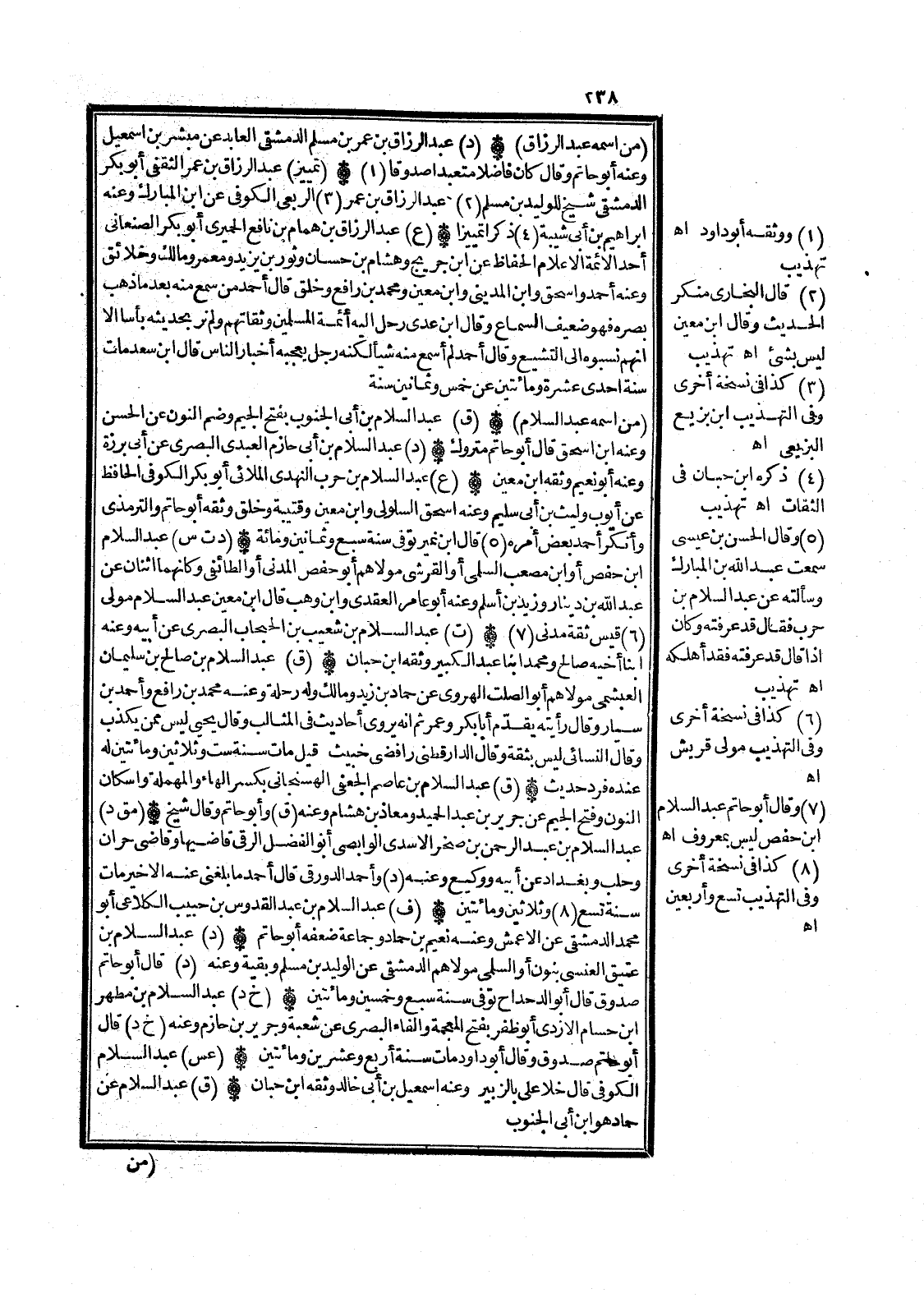 (ع) عبد الرَّزَّاق بن همام بن نَافِع الْحِمْيَرِي أَبُو بكر الصَّنْعَانِيّ أحد الْأَئِمَّة الْأَعْلَام الْحفاظ عَن ابْن جريج وَهِشَام بن حسان وثور بن يزِيد وَمعمر وَمَالك وخلائق وَعنهُ أَحْمد وَإِسْحَاق وَابْن الْمَدِينِيّ وَابْن معِين وَمُحَمّد بن رَافع وَخلق قَالَ أَحْمد من سمع مِنْهُ بَعْدَمَا ذهب بَصَره فَهُوَ ضَعِيف السماع وَقَالَ ابْن عدي رَحل إِلَيْهِ أَئِمَّة الْمُسلمين وثقاتهم وَلم نر بحَديثه بَأْسا إِلَّا أَنهم نسبوه إِلَى التَّشَيُّع وَقَالَ أَحْمد لم أسمع مِنْهُ شَيْئا لكنه رجل يُعجبهُ أَخْبَار النَّاس قَالَ ابْن سعد مَاتَ سنة إِحْدَى عشرَة وَمِائَتَيْنِ عَن خمس وَثَمَانِينَ سنة