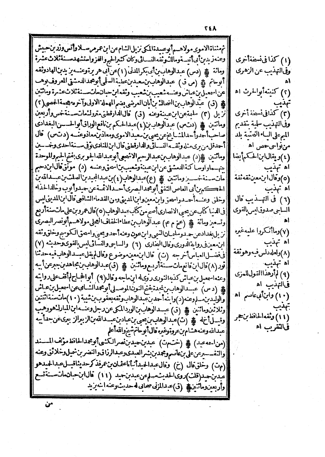 (د ت س) عبد الْوَهَّاب بن (4) عبد الحكم بن نَافِع الْوراق أَبُو الْحسن الْبَغْدَادِيّ صَاحب أَحْمد وَأحد الْمَشَايِخ عَن يحيى بن سعيد الْأمَوِي ومعاذ بن معَاذ وَعنهُ (د ت س) قَالَ أَحْمد قل من يرى مثله وَثَّقَهُ النَّسَائِيّ وَالدَّارَقُطْنِيّ قَالَ ابْن المنادى توفّي سنة إِحْدَى وَخمسين وَمِائَتَيْنِ
