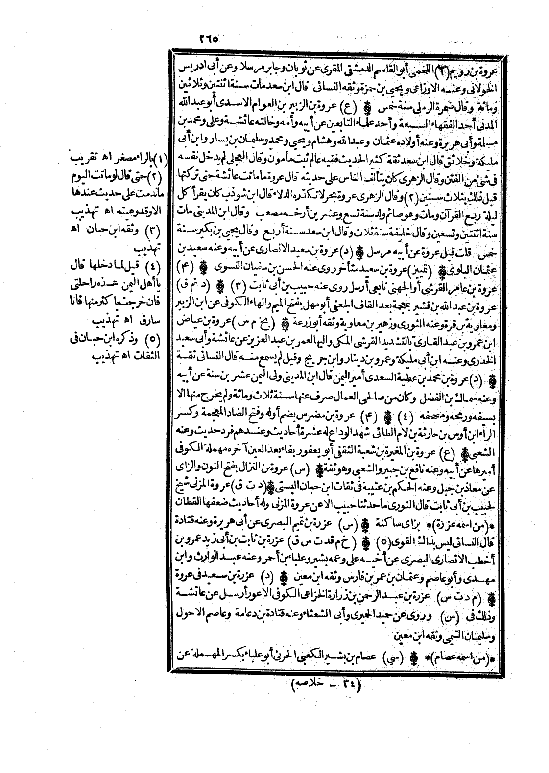 (ع) عُرْوَة بن الزبير بن الْعَوام الْأَسدي أَبُو عبد الله الْمدنِي أحد الْفُقَهَاء السَّبْعَة وَأحد عُلَمَاء التَّابِعين عَن أَبِيه وَأمه وخالته عَائِشَة وَعلي وَمُحَمّد بن مسلمة وَأبي هُرَيْرَة وَعنهُ أَوْلَاده عُثْمَان وَعبد الله وَهِشَام وَيحيى وَمُحَمّد وَسليمَان بن يسَار وَابْن أبي مليكَة وخلائق قَالَ ابْن سعد ثِقَة كثير الحَدِيث فَقِيه عَالم ثَبت مَأْمُون وَقَالَ الْعجلِيّ لم يدْخل نَفسه فِي شَيْء من الْفِتَن وَقَالَ الزُّهْرِيّ كَانَ يتألف النَّاس على حَدِيثه قَالَ عُرْوَة مَا مَاتَت عَائِشَة حَتَّى تركتهَا قبل ذَلِك بِثَلَاث سِنِين (2) وَقَالَ الزُّهْرِيّ عُرْوَة بَحر لَا تكدره الدلاء قَالَ ابْن شَوْذَب كَانَ يقْرَأ كل لَيْلَة ربع الْقُرْآن وَمَات وَهُوَ صَائِم ولد سنة تسع وَعشْرين أرخه مُصعب وَقَالَ ابْن الْمَدِينِيّ مَاتَ سنة اثْنَتَيْنِ وَتِسْعين وَقَالَ خَليفَة سنة ثَلَاث وَقَالَ ابْن سعد سنة أَربع وَقَالَ يحيى بن بكير سنة خمس قلت قيل عُرْوَة عَن أَبِيه مُرْسل