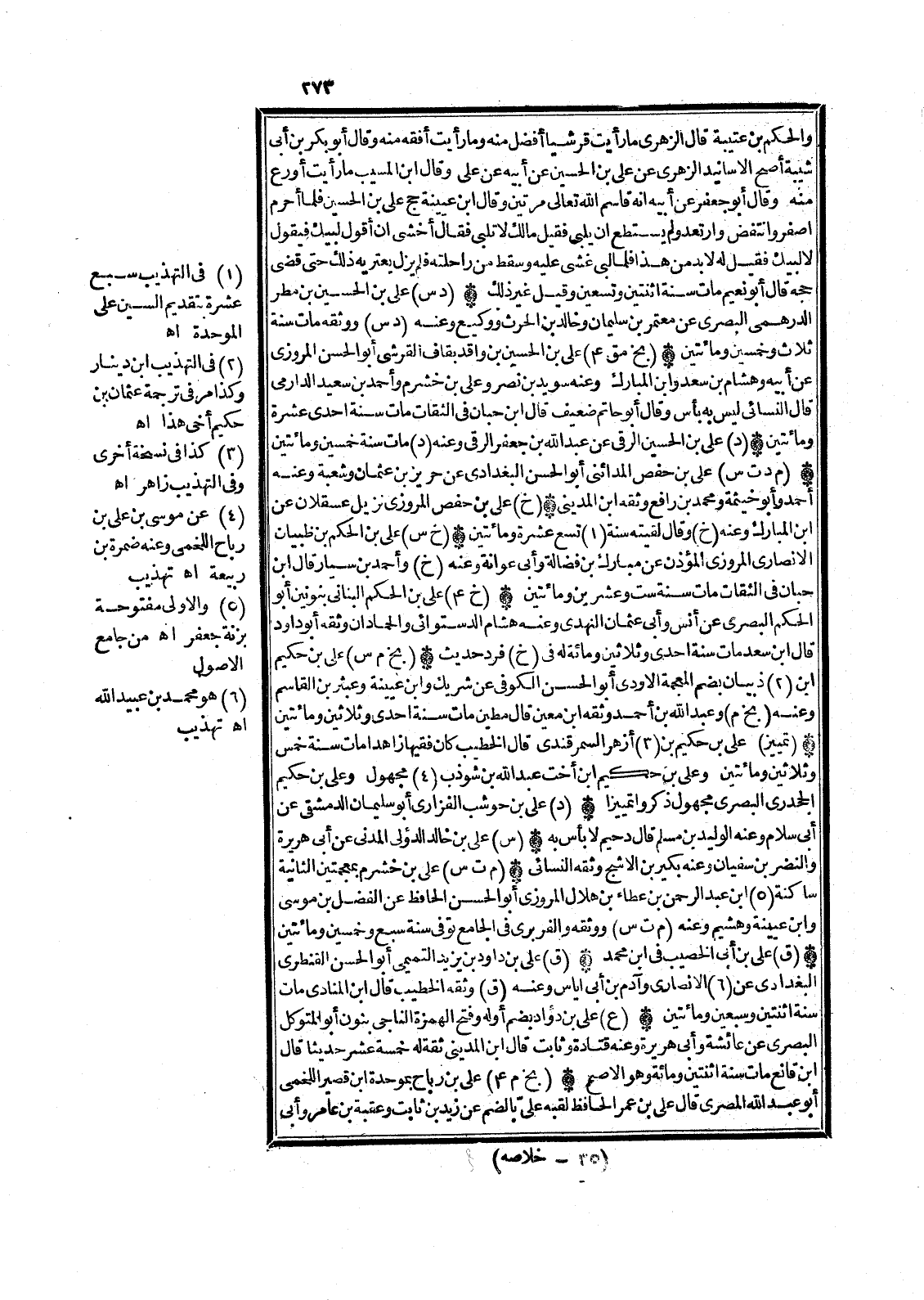(م ت س) عَليّ بن خشرم بمعجمتين الثَّانِيَة سَاكِنة (5) ابْن عبد الرَّحْمَن بن عَطاء بن هِلَال الْمروزِي أَبُو الْحسن الْحَافِظ عَن الْفضل بن مُوسَى وَابْن عُيَيْنَة وهشيم وَعنهُ (م ت س) وَوَثَّقَهُ والفربري فِي الْجَامِع توفّي سنة سبع وَخمسين وَمِائَتَيْنِ