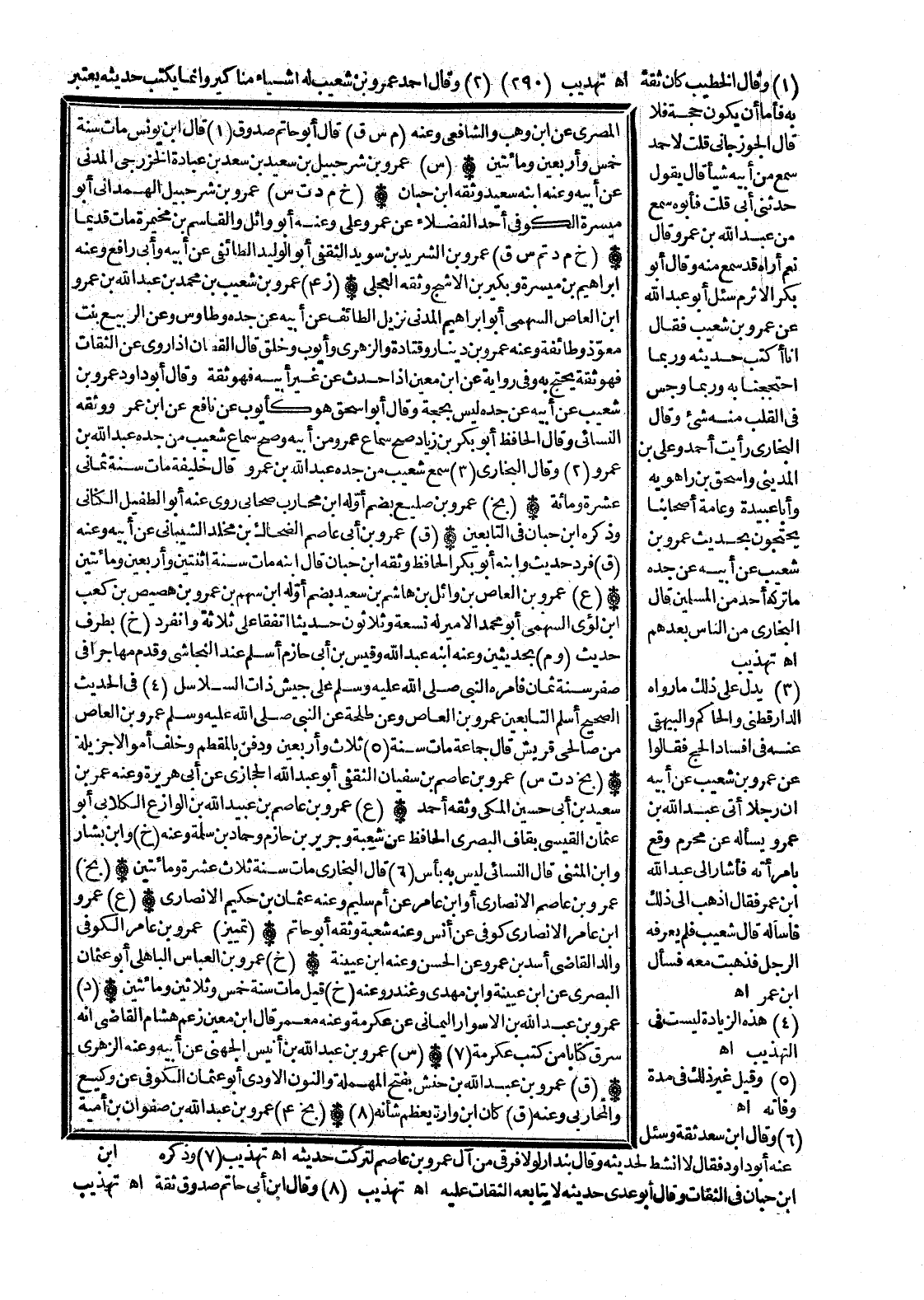 (ز ع أ) عَمْرو بن شُعَيْب بن مُحَمَّد بن عبد الله بن عَمْرو ابْن الْعَاصِ السَّهْمِي أَبُو إِبْرَاهِيم الْمدنِي نزيل الطَّائِف عَن أَبِيه عَن جده وَطَاوُس وَعَن الرّبيع بنت معوذ وَطَائِفَة وَعنهُ عَمْرو بن دِينَار وَقَتَادَة وَالزهْرِيّ وَأَيوب وَخلق قَالَ الْقطَّان إِذا روى عَن الثِّقَات فَهُوَ ثِقَة يحْتَج بِهِ وَفِي رِوَايَة عَن ابْن معِين إِذا حدث عَن غير أَبِيه فَهُوَ ثِقَة وَقَالَ أَبُو دَاوُد عَمْرو بن شُعَيْب عَن أَبِيه عَن جده لَيْسَ بِحجَّة وَقَالَ أَبُو إِسْحَاق هُوَ كأيوب عَن نَافِع عَن ابْن عمر وَوَثَّقَهُ النَّسَائِيّ وَقَالَ الْحَافِظ أَبُو بكر بن زِيَاد صَحَّ سَماع عَمْرو من أَبِيه وَصَحَّ سَماع شُعَيْب من جده عبد الله بن عَمْرو (2) وَقَالَ البُخَارِيّ (3) سمع شُعَيْب من جده عبد الله بن عَمْرو قَالَ خَليفَة مَاتَ سنة ثَمَانِي عشرَة وَمِائَة