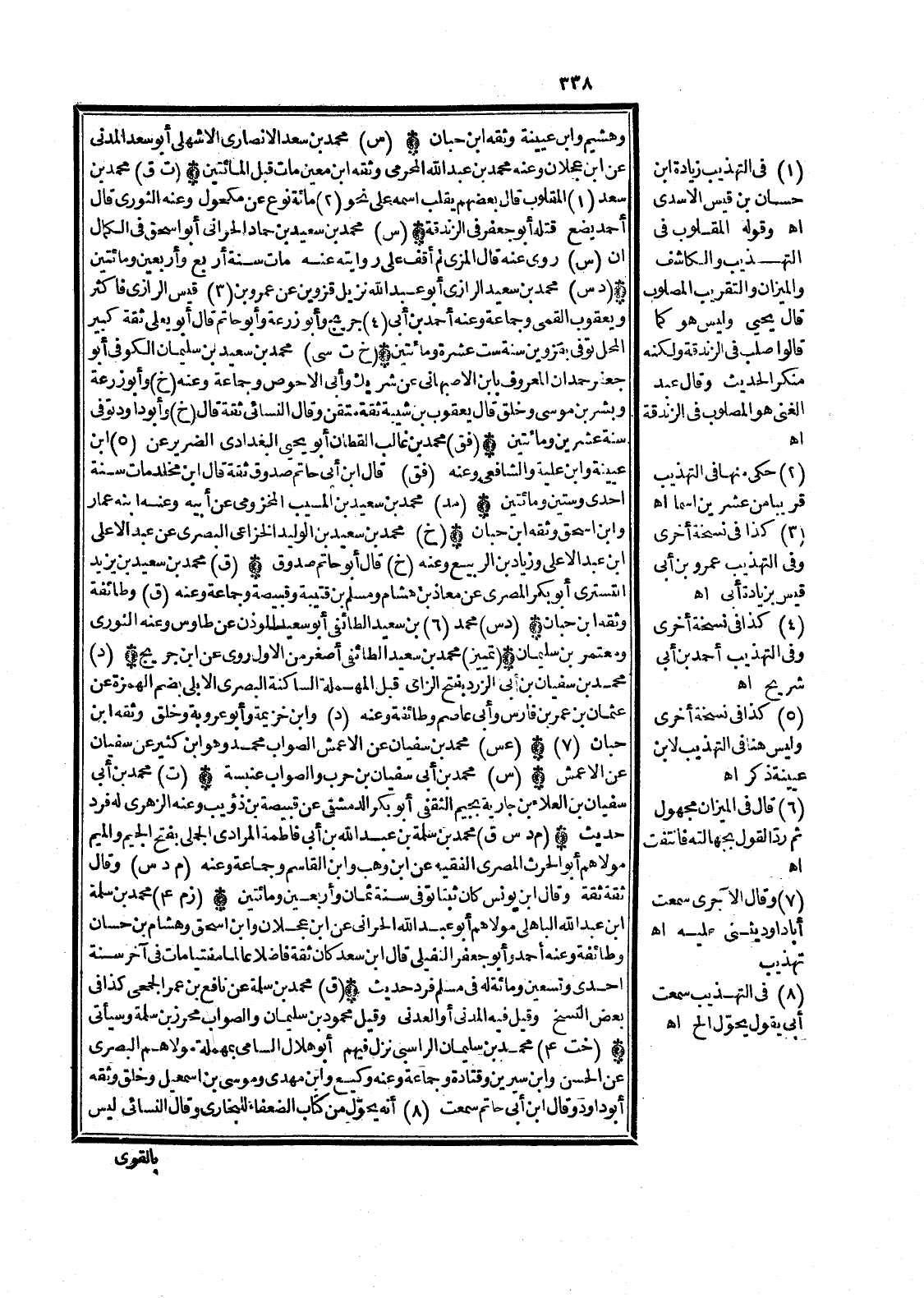 (خت ع أ) مُحَمَّد بن سُلَيْمَان الرَّاسِبِي نزل فيهم أَبُو هِلَال السَّامِي بِمُهْملَة مَوْلَاهُم الْبَصْرِيّ عَن الْحسن وَابْن سِيرِين وَقَتَادَة وَجَمَاعَة وَعنهُ وَكِيع وَابْن مهْدي ومُوسَى بن إِسْمَاعِيل وَخلق وَثَّقَهُ أَبُو دَاوُد وَقَالَ ابْن أبي حَاتِم سَمِعت (8) أَنه يحول من كتاب الضُّعَفَاء للْبُخَارِيّ وَقَالَ النَّسَائِيّ لَيْسَ هَامِش