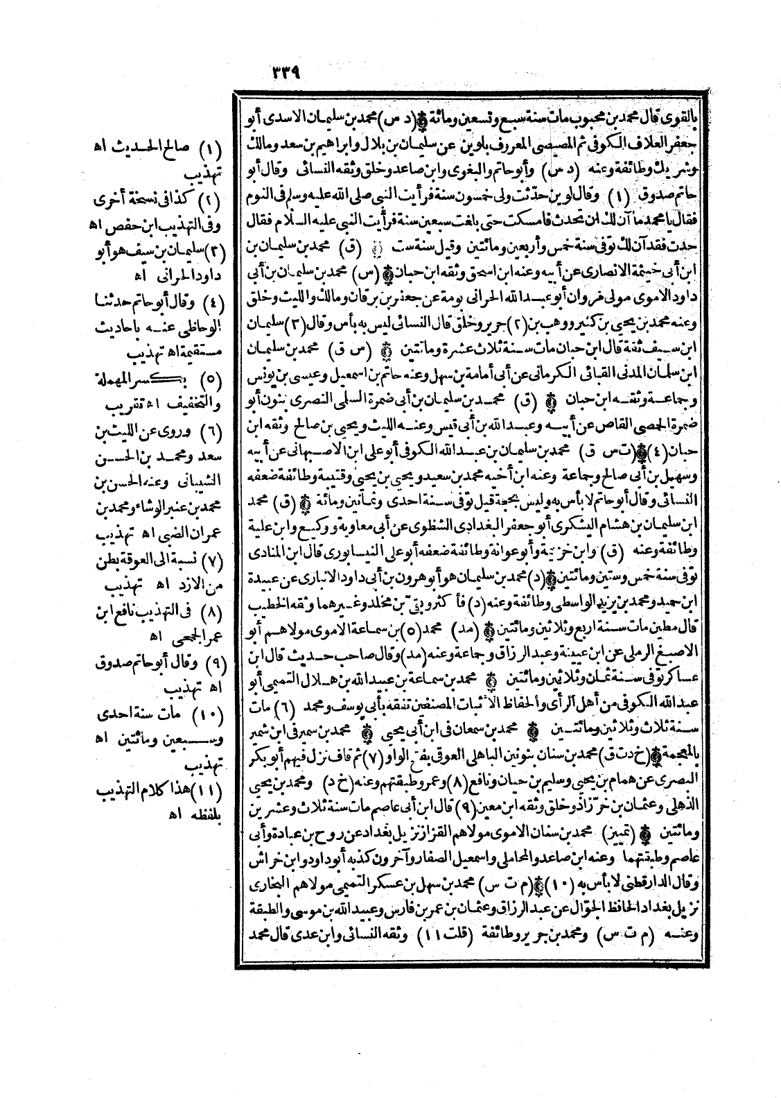 (د س) مُحَمَّد بن سُلَيْمَان الْأَسدي أَبُو جَعْفَر العلاف الْكُوفِي ثمَّ المصِّيصِي الْمَعْرُوف بلوين عَن سُلَيْمَان بن بِلَال وَإِبْرَاهِيم بن سعد وَمَالك وَشريك وَطَائِفَة وَعنهُ (د س) وَأَبُو حَاتِم وَالْبَغوِيّ وَابْن صاعد وَخلق وَثَّقَهُ النَّسَائِيّ وَقَالَ أَبُو حَاتِم صَدُوق (1) وَقَالَ لوين حدثت ولي خَمْسُونَ سنة فَرَأَيْت النَّبِي فِي النّوم فَقَالَ يَا مُحَمَّد مَا آن لَك ان تحدث فامسكت حَتَّى بلغت سبعين سنة فَرَأَيْت النَّبِي عَلَيْهِ السَّلَام فَقَالَ حدث فقد آن لَك توفّي سنة خمس وَأَرْبَعين وَمِائَتَيْنِ وَقيل سنة سِتّ