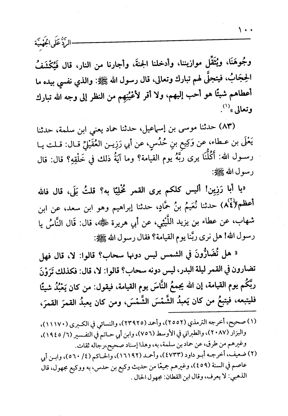 (83) حدثنا موسى بن إسماعيل، حدثنا حماد يعني ابن سلمة، حدثنا يَعْلَى بن عطاء، عن وَكِيعِ بنِ حُدُسٍ، عن أبي رَزِين العُقَيْليِّ قال: قلت يا رسول الله: أَكُلُّنَا يرى ربَّهُ يوم القيامة؟ وما آيَةُ ذلك في خَلْقِهِ؟ قال: قال رسول الله - صلى الله عليه وسلم -: