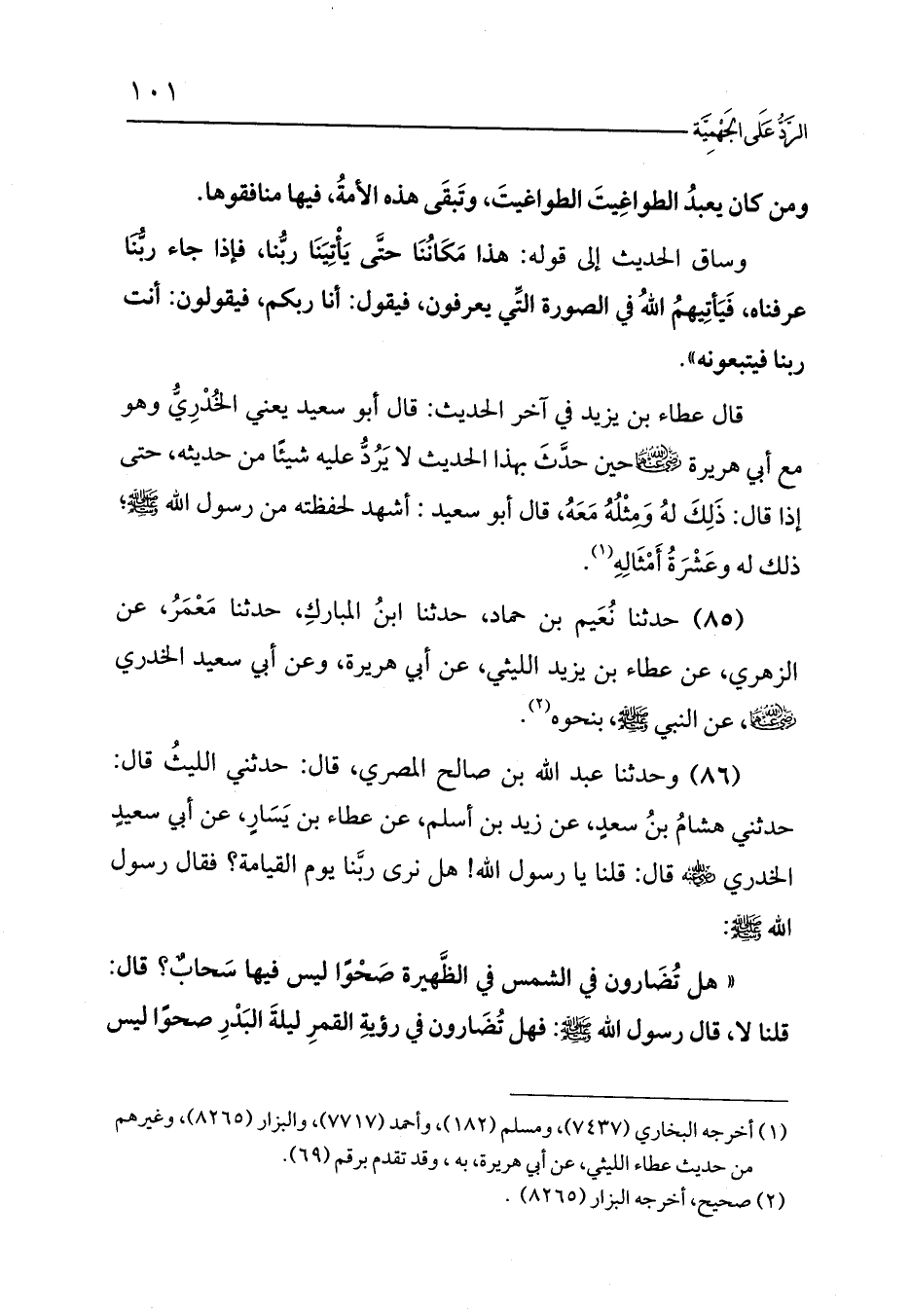(86) وحدثنا عبد الله بن صالح المصري، قال: حدثني الليثُ قال: حدثني هشامُ بنُ سعدٍ، عن زيد بن أسلم، عن عطاء بن يَسَارٍ، عن أبي سعيدٍ الخدري - رضي الله عنه - قال: قلنا يا رسول الله! هل نرى ربَّنا يوم القيامة؟ فقال رسول الله - صلى الله عليه وسلم -:
