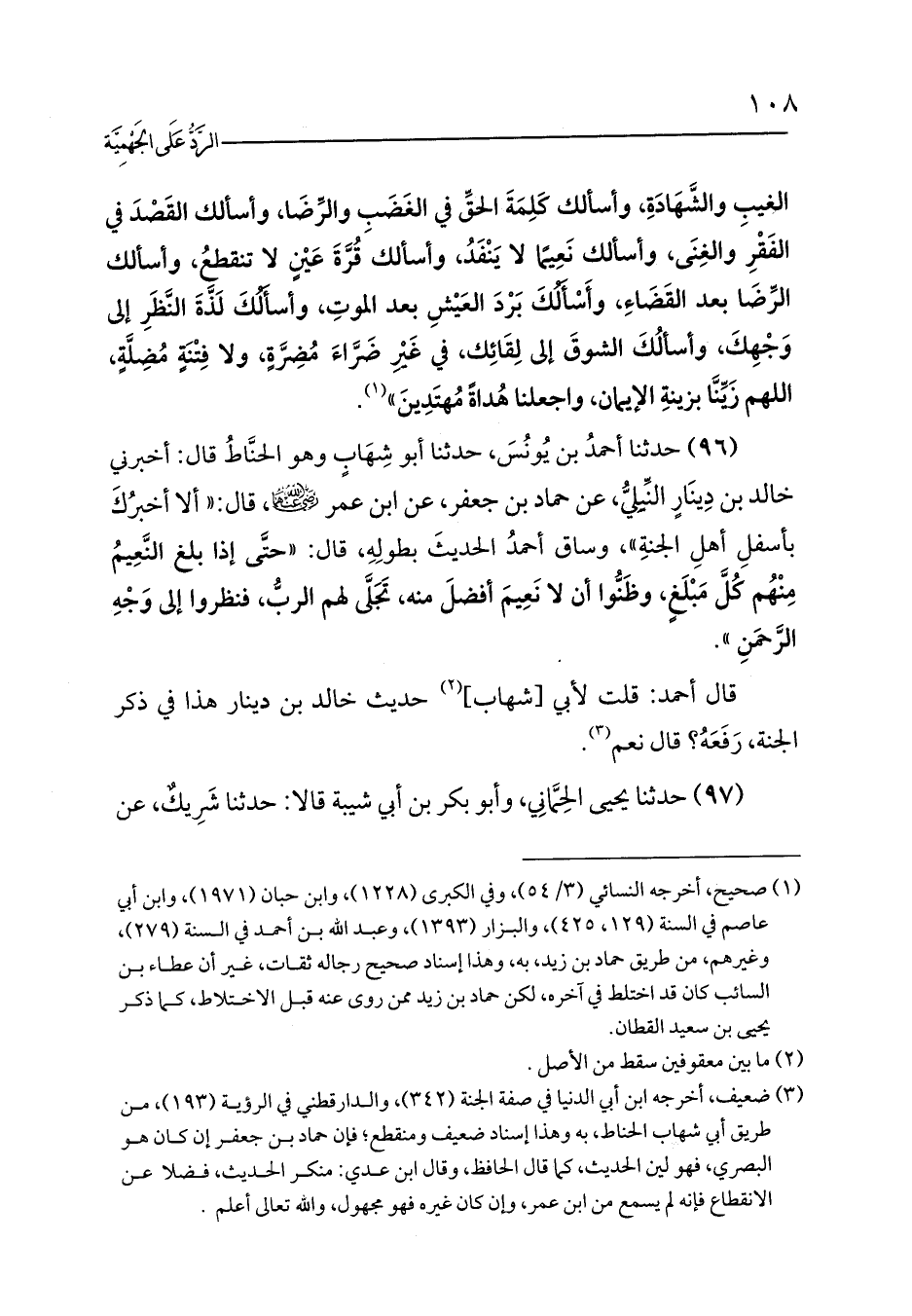 (96) حدثنا أحمدُ بن يُونُسَ، حدثنا أبو شِهَابٍ وهو الحنَّاطُ قال: أخبرني خالد بن دِينَارٍ النِّيلِيُّ، عن حماد بن جعفر، عن ابن عمر ?، قال: «ألا أخبرُكَ بأسفلِ أهلِ الجنةِ»، وساق أحمدُ الحديثَ بطولِهِ، قال: «حتَّى إذا بلغ النَّعِيمُ مِنْهُم كُلَّ مَبْلَغٍ، وظَنُّوا أن لا نَعِيمَ أفضلَ منه، تَجَلَّى لهم الربُّ، فنظروا إلى وَجْهِ الرَّحمَنِ».