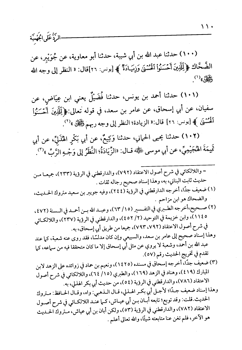 (100) حدثنا عبد الله بن أبي شيبة، حدثنا أبو معاوية، عن جُوَيْبِر، عن الضَّحَّاك {لِلَّذِينَ أَحْسَنُوا الْحُسْنَى وَزِيَادَةٌ} [يونس: 26] قال: «النظر إلى وجه الله - عز وجل -» (¬1).