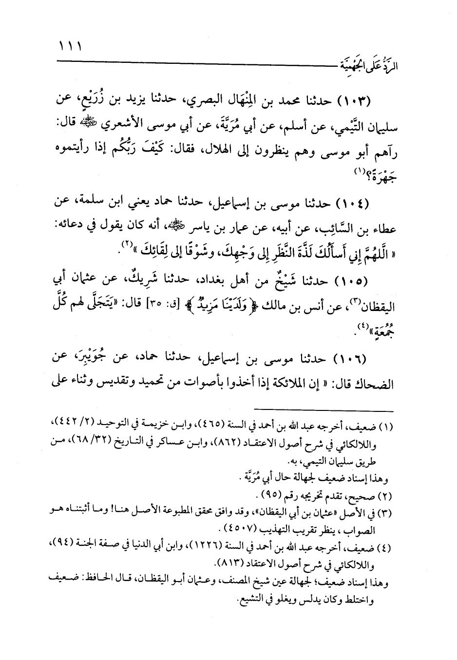 (105) حدثنا شَيْخٌ من أهل بغداد، حدثنا شَرِيكٌ، عن عثمان أبي اليقظان (¬3)، عن أنس بن مالك {وَلَدَيْنَا مَزِيدٌ} [ق: 35] قال: «يَتَجَلَّى لهم كُلَّ جُمُعَةٍ» (¬4).