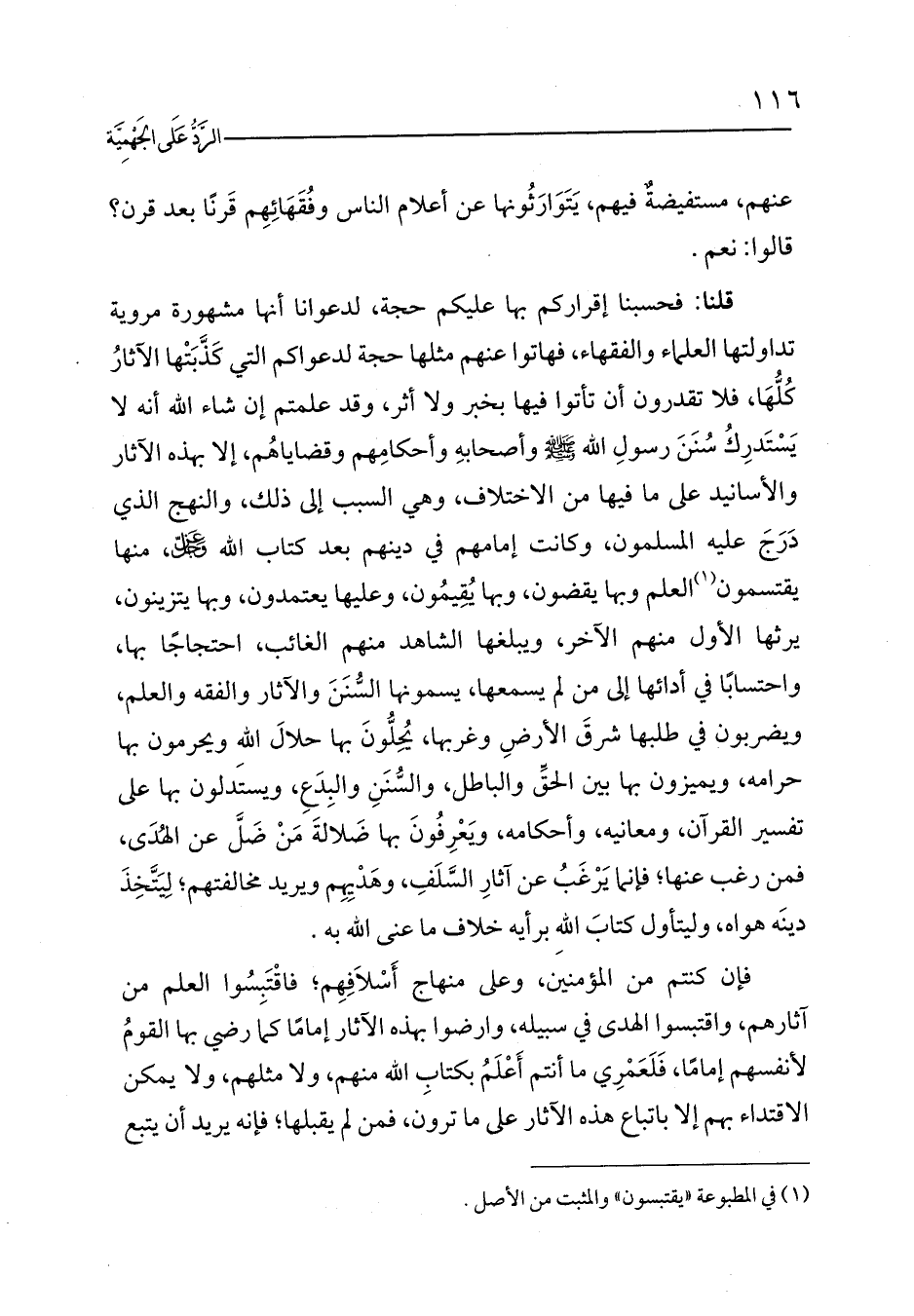 فإن كنتم من المؤمنين، وعلى منهاج أَسْلاَفِهِم؛ فاقْتَبِسُوا العلم من آثارهم، واقتبسوا الهدى في سبيله، وارضوا بهذه الآثار إمامًا كما رضي بها القومُ لأنفسهم إمامًا، فَلَعَمْرِي ما أنتم أَعْلَمُ بكتابِ الله منهم، ولا مثلهم، ولا يمكن الاقتداء بهم إلا باتباع هذه الآثار على ما ترون، فمن لم يقبلها؛ فإنه يريد أن يتبع
